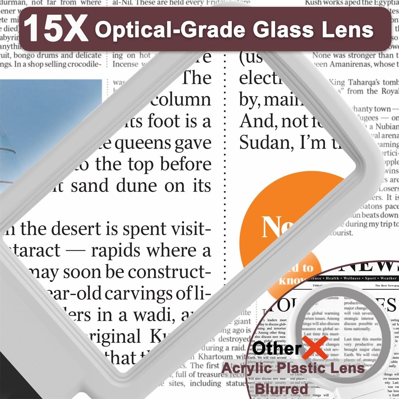 15X Magnifying Glass with Light and Stand, Real Glass Lens, Rechargeable Foldabl