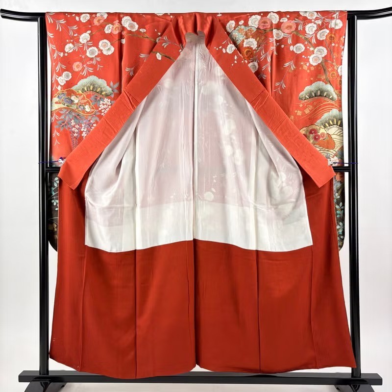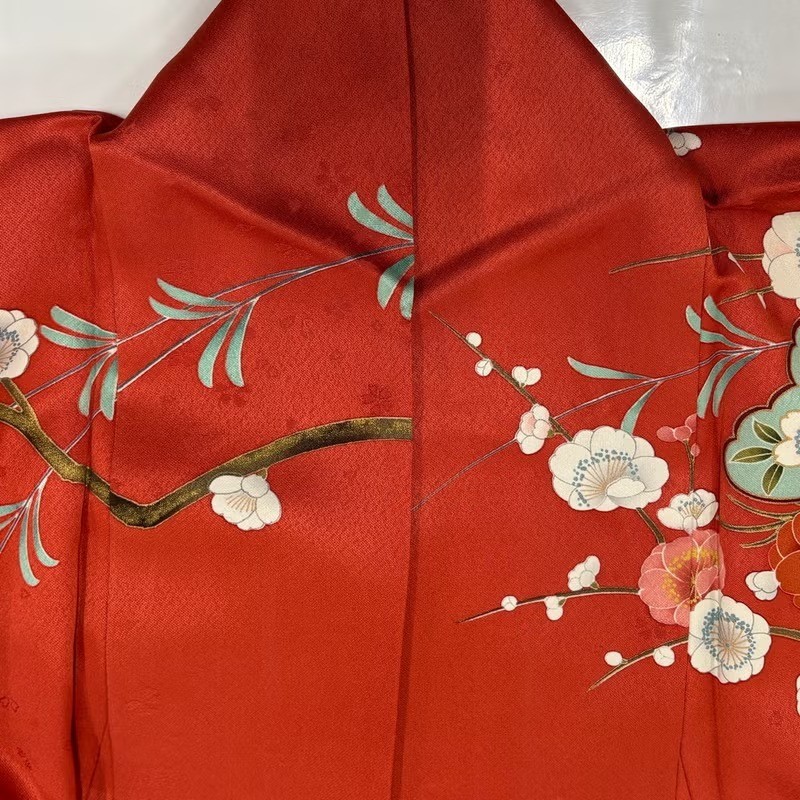 Woman Japanese Kimono Furisode Silk Cherry blossom Kasamatsu Gold Foil Red 155cm