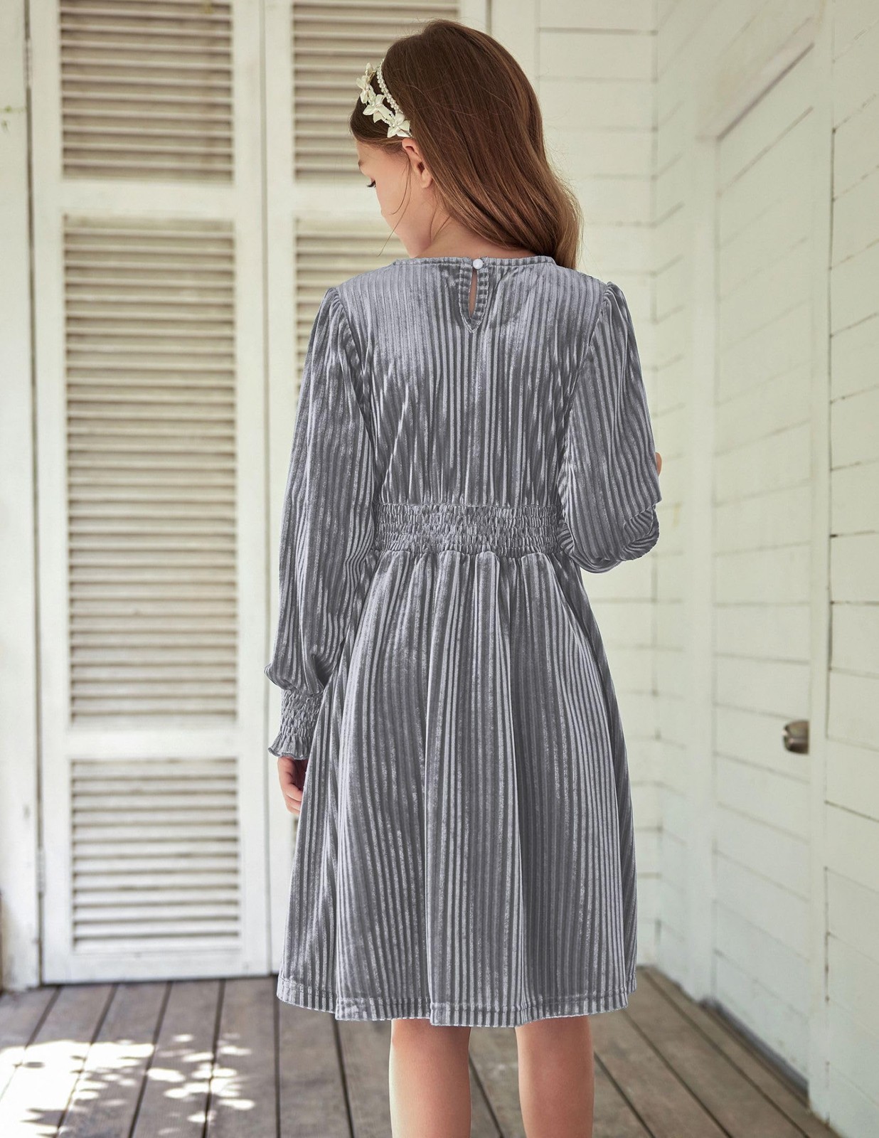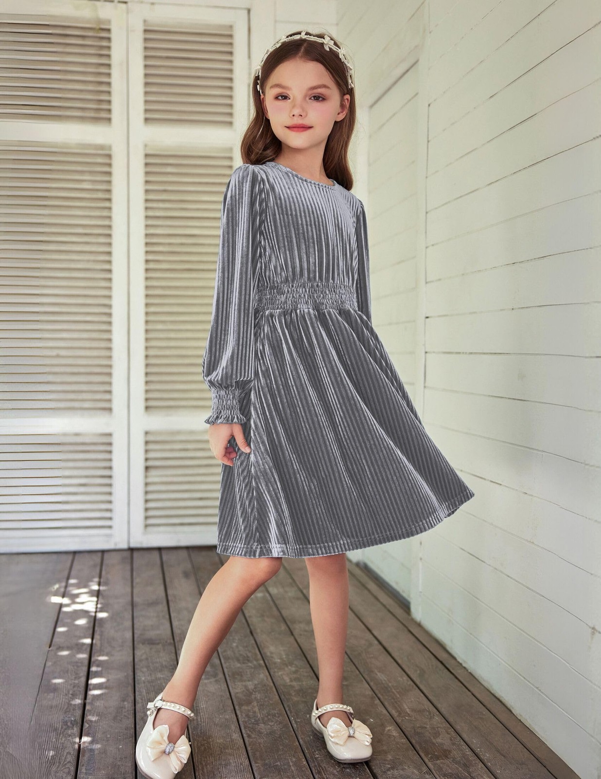 как выглядит Girls 4-13Y Gray Long Sleeve Velvet Dress Crew Neck Fall Plain Dress for Kids фото