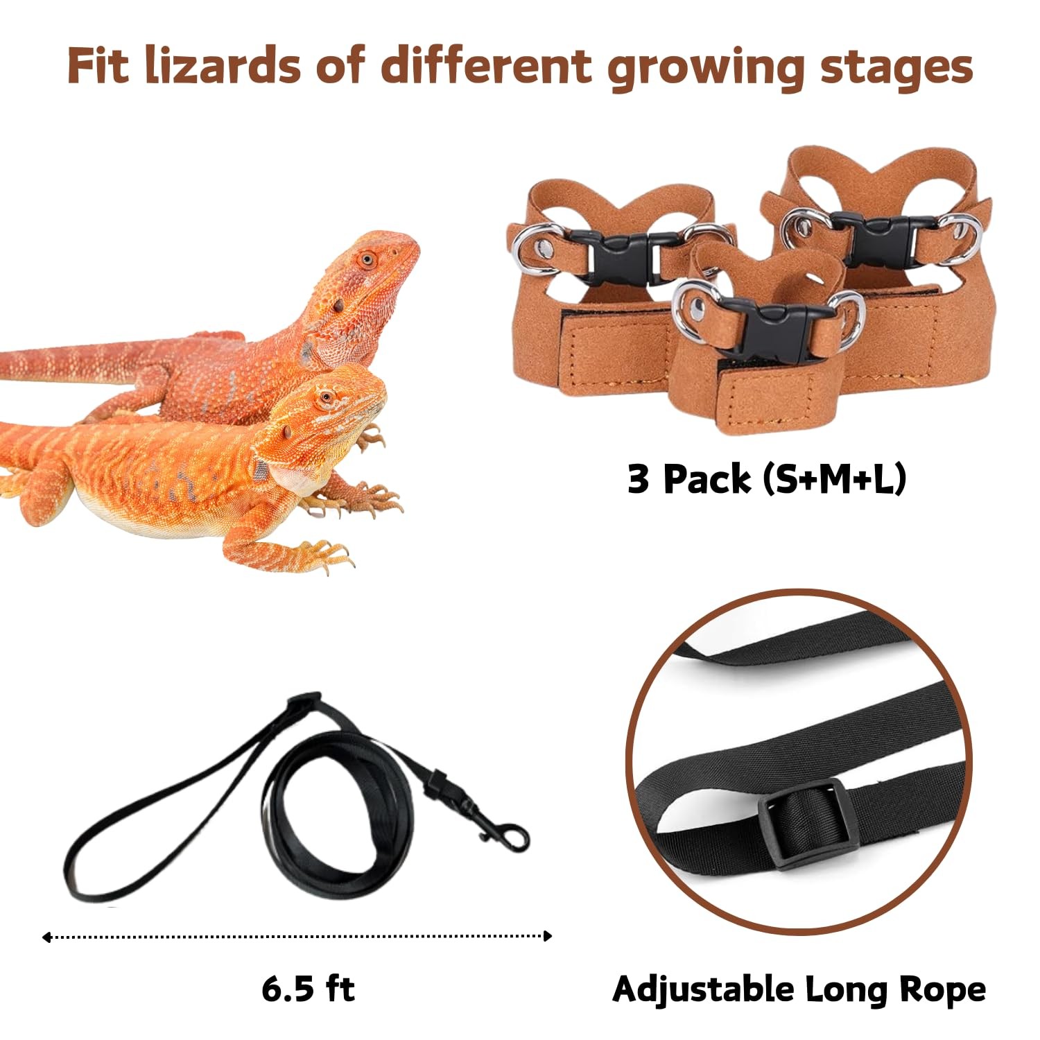 как выглядит 3 Pack Bearded Dragon Harness and Leash Set - Adjustable Soft Leather Lizard ... фото