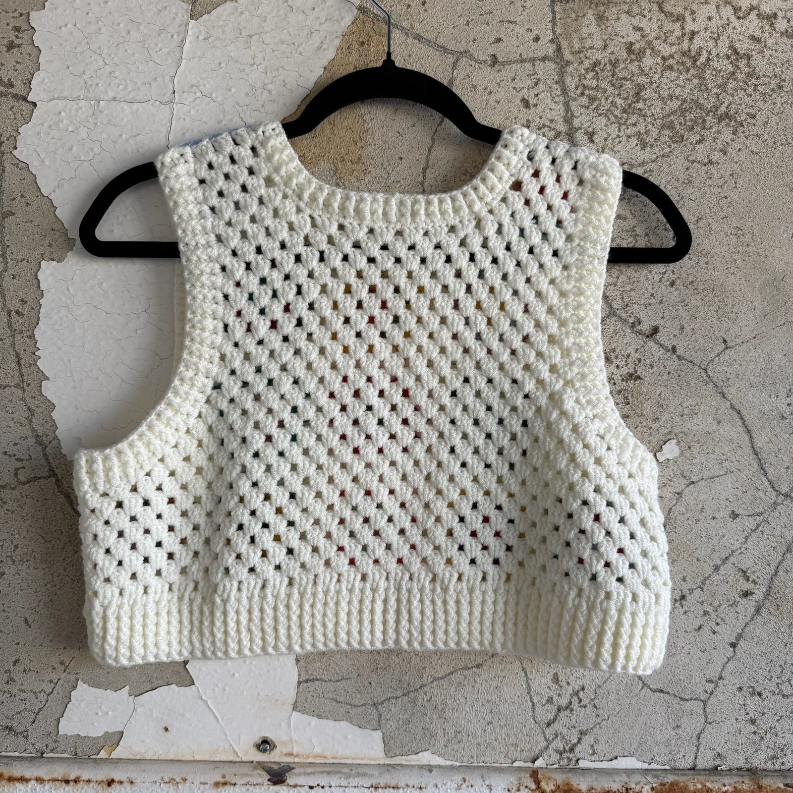 Crochet Granny Square Sweater Vest Handmade Multicolor White Small Cottagecore