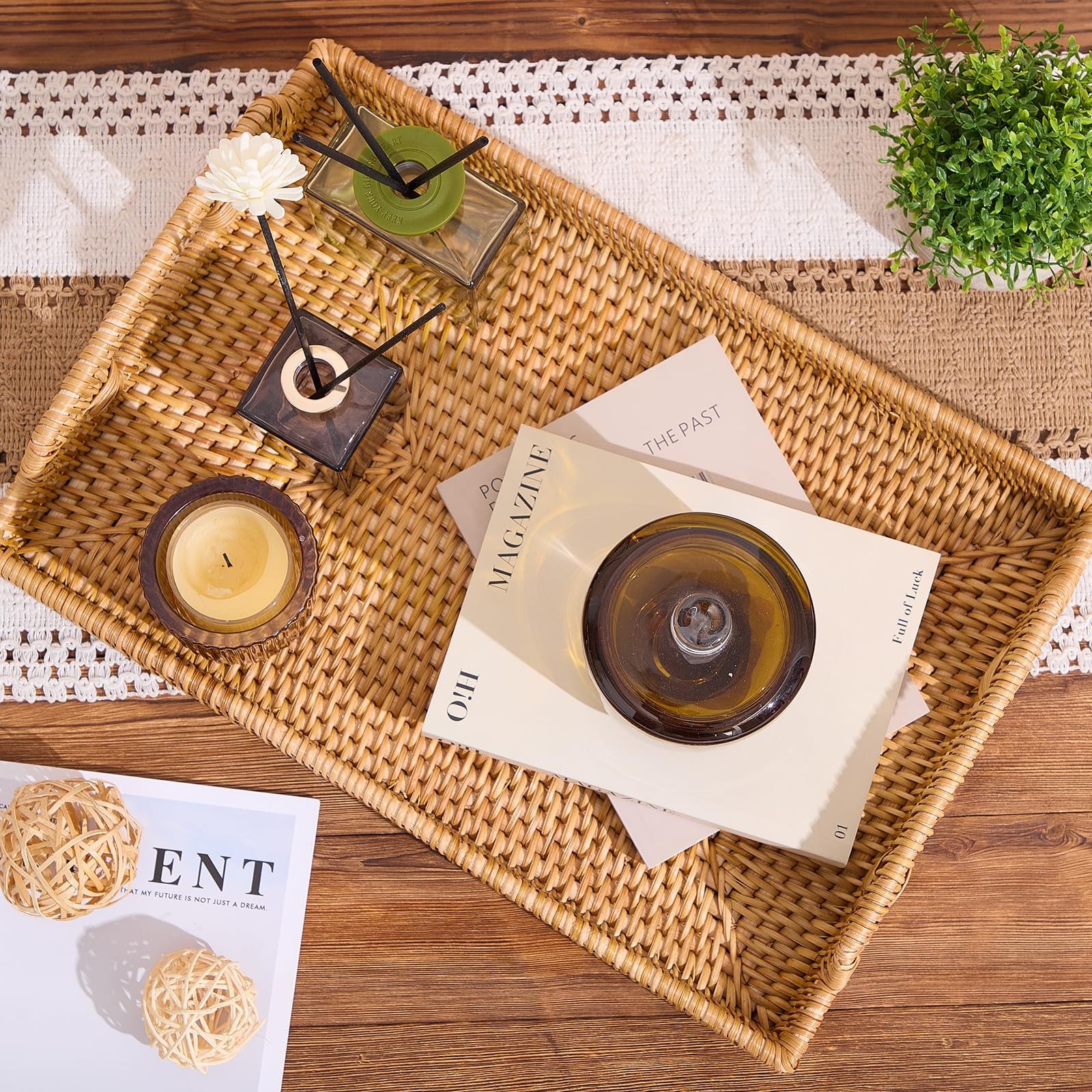 Rattan Rectangular Serving Tray with Handles, Hand-Woven Wicker Decorative Tr...