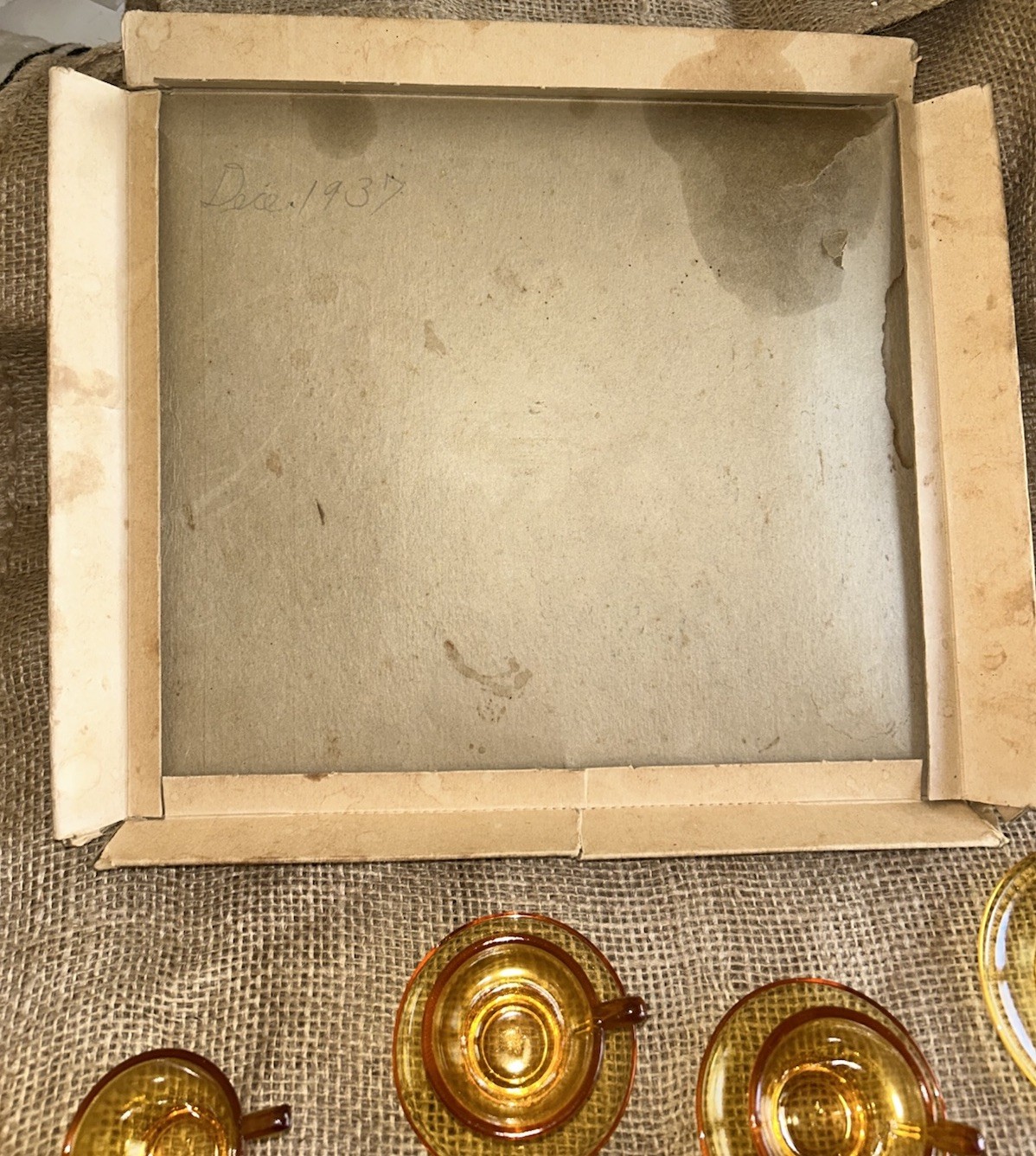 VTG 37 PLAY TIME GLASS DISHES Akro Agate Topaz Cup Plate Tea Set 2000 Box USA