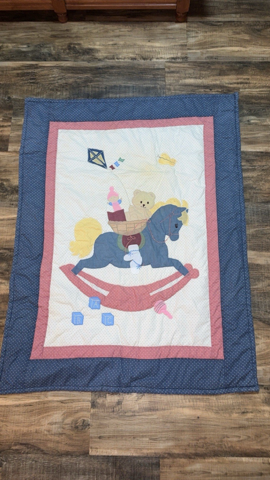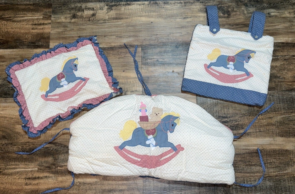 как выглядит Vintage Rocking Horse Teddy Bear Baby Crib Bedding 10 Pc Set Blue Pink Nursery фото