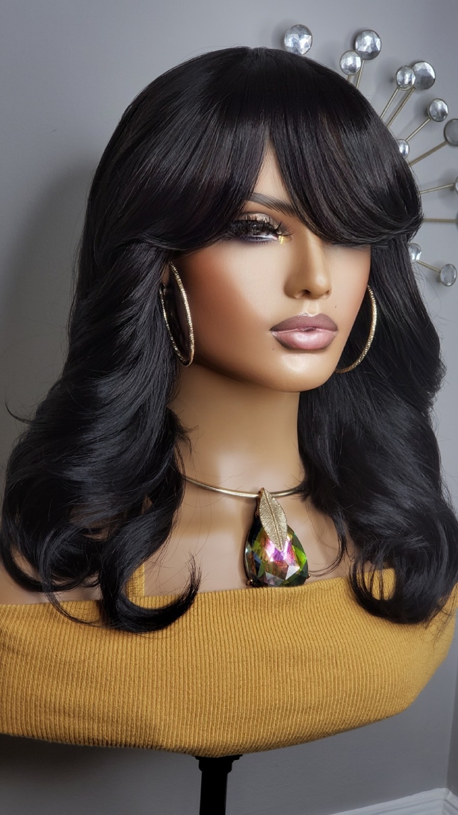 как выглядит New Black Curtain Bangs Style Full Cap Wig Feathered Curls Womens Hair Wig фото