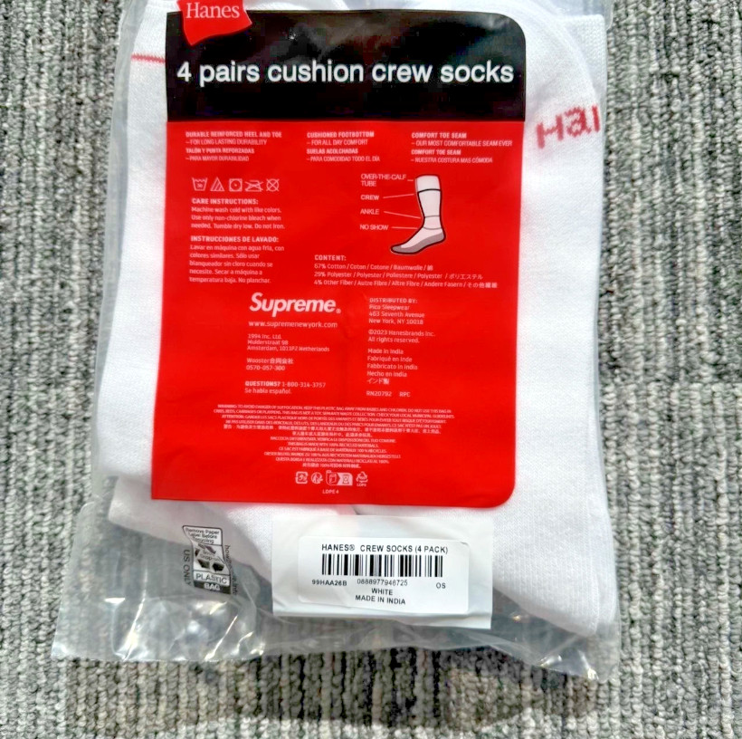 как выглядит Supreme x Hanes Cushioned Crew Socks White 4 Pairs Reinforced Toe Size 6-12 фото