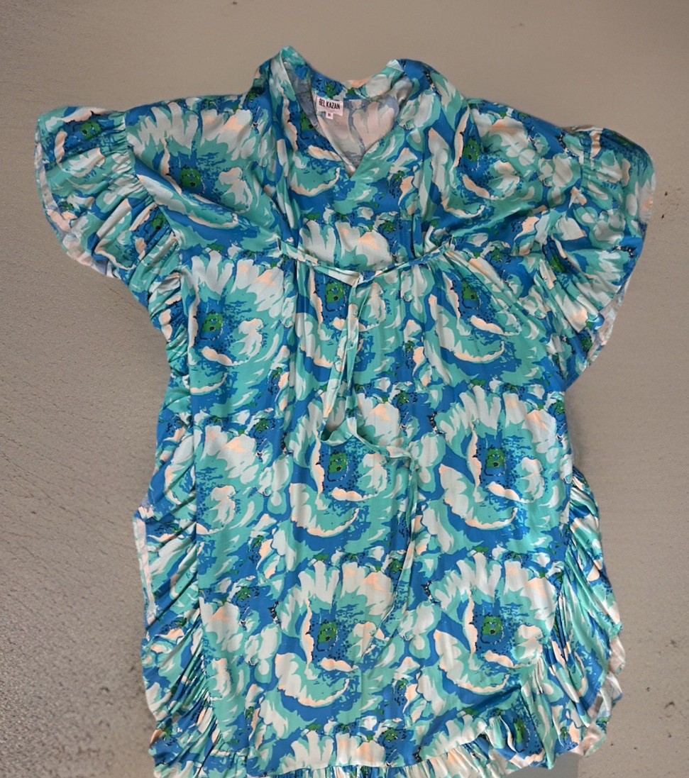 как выглядит Anthropologie Bel Kazan Exotic Blue White Kaftan Maxi Ruffles,One Size Goddess фото