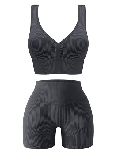 Womens Workout Sets 2 Piece Seamless Ribbed Acid Wash Yoga Outfits Large Black