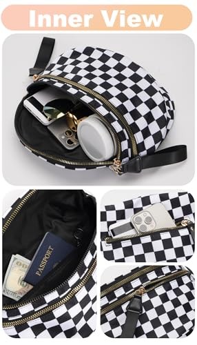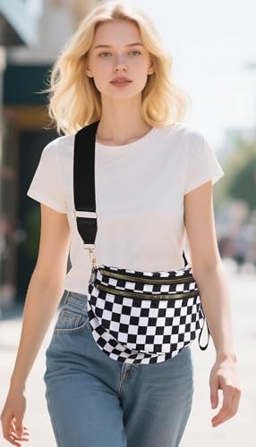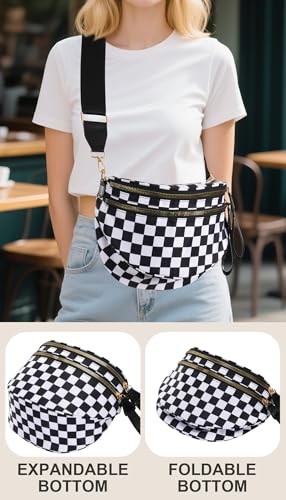 Checkered Crossbody Bag Large Nylon Bum Bags for Women Spacious Checkered Black