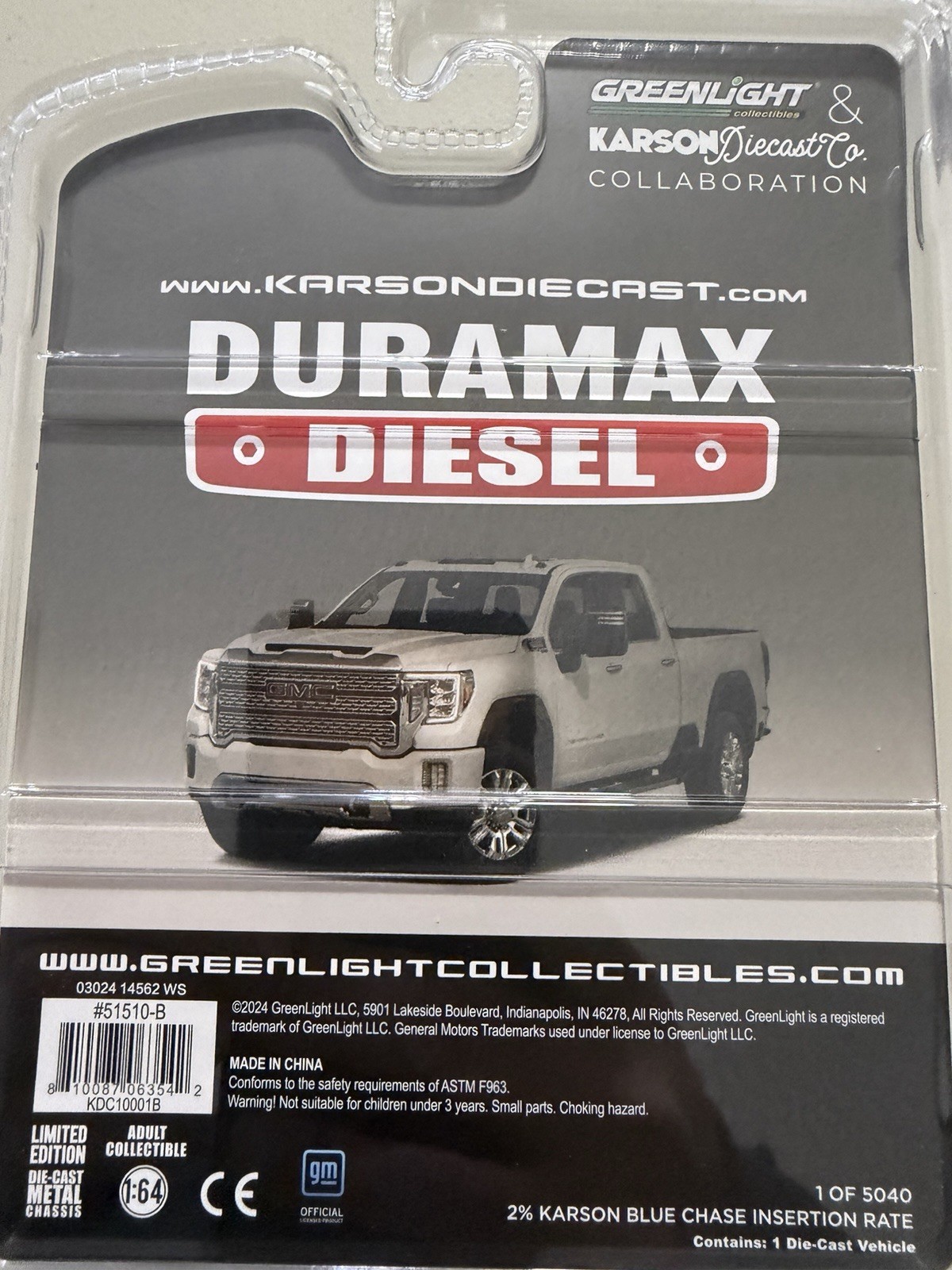 1:64 Greenlight 2022 GMC Sierra 2500 HD Denali White Frost Metallic Karson Excl