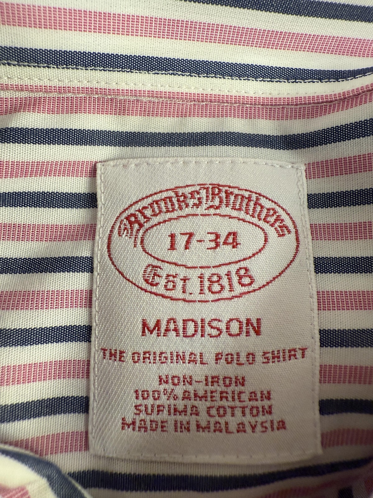 Brooks Brothers Shirt Mens 17-34 Pink Blue Stripe Madison Non Iron Supima Dress