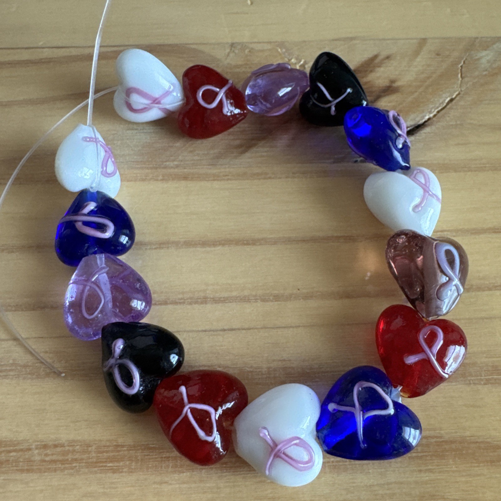 как выглядит 15 MIXED COLOR BREAST CANCER SYMBOL HEART lampwork Glass Beads. 15mm- DIY CRAFT фото