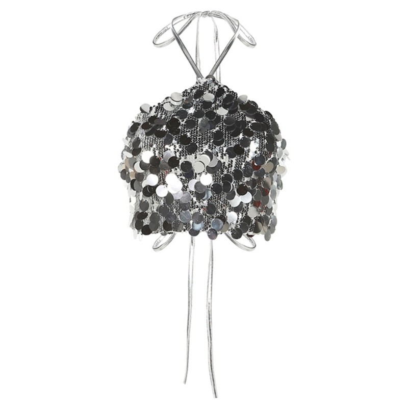 Womens Glitter Metallic Sequin Halter Neck Crop Top Club Party Festival Camisole