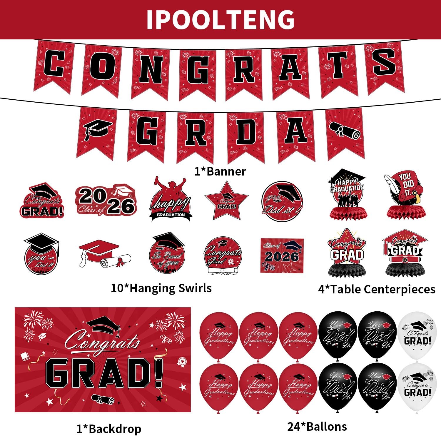 Graduation Decorations 2026 Set - Red Themed Congrats Grad Banner, Backdrop, ...