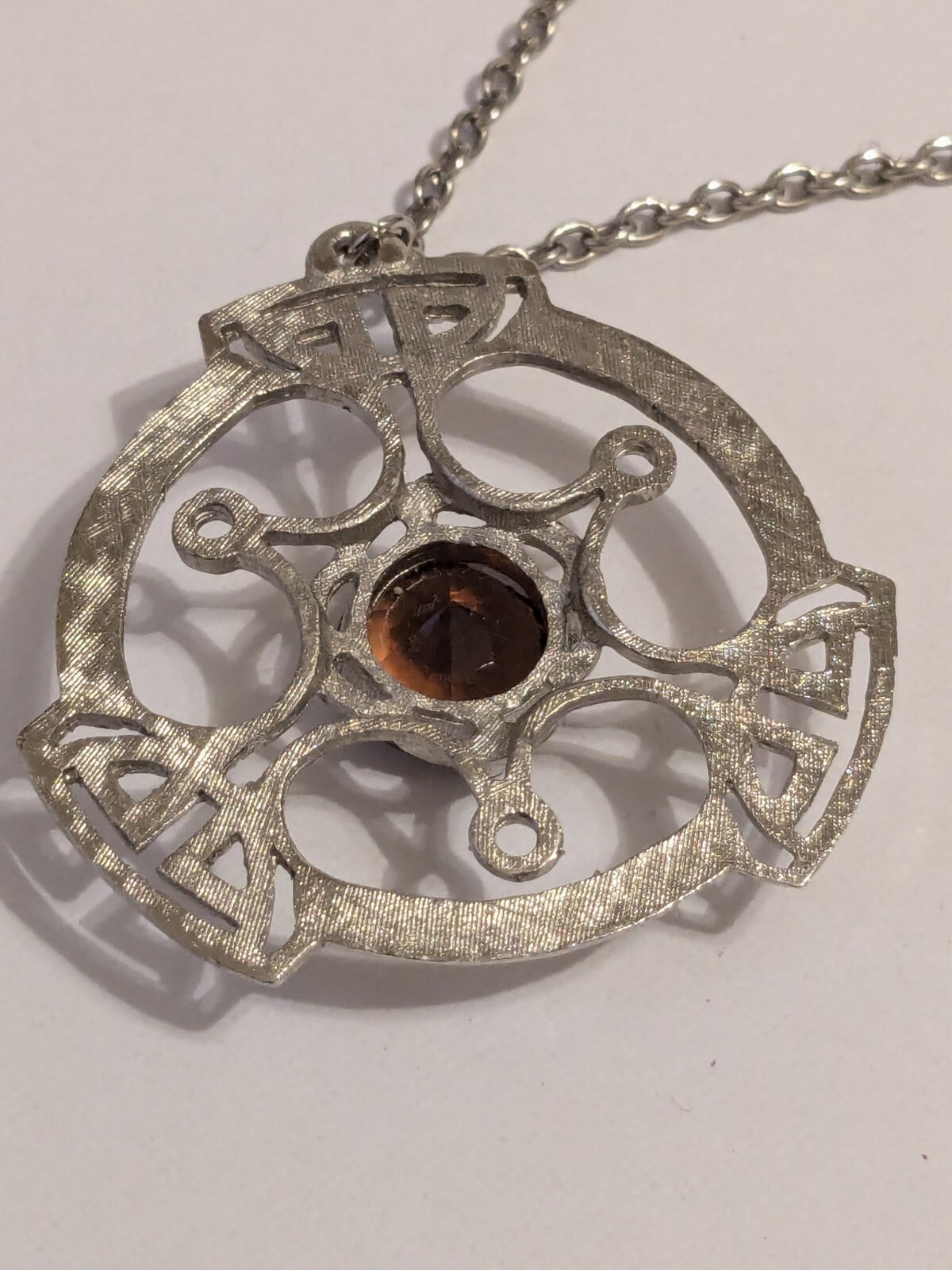 Silver Tone Wheel Style Pendant With Acrylic Amber Prong Set Bead Necklace. 23