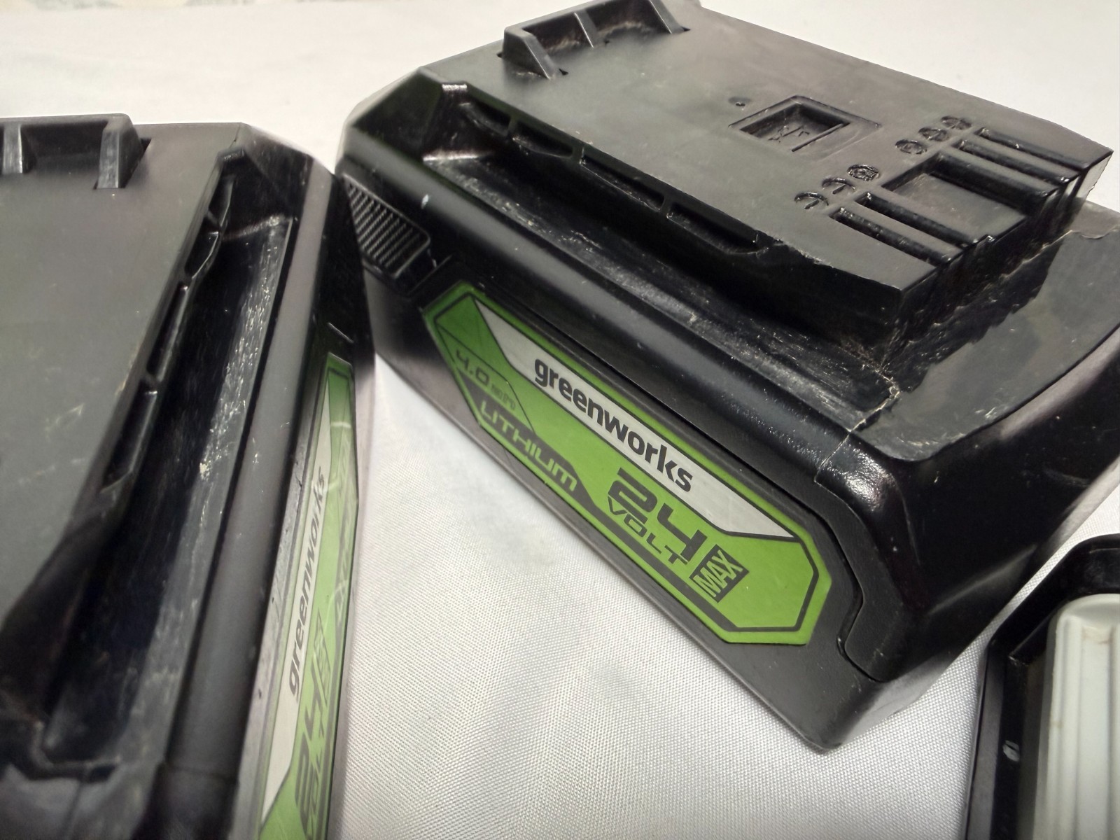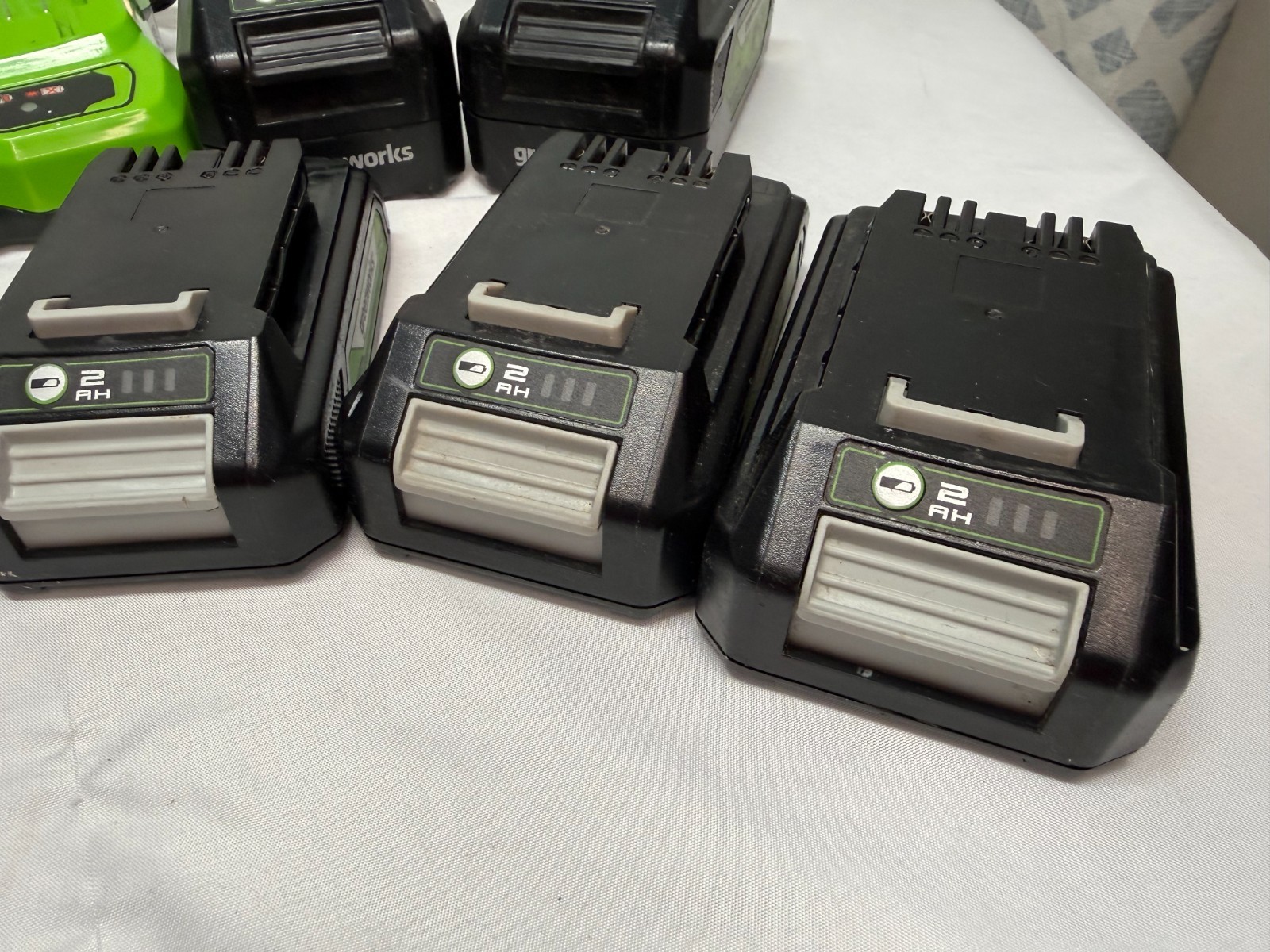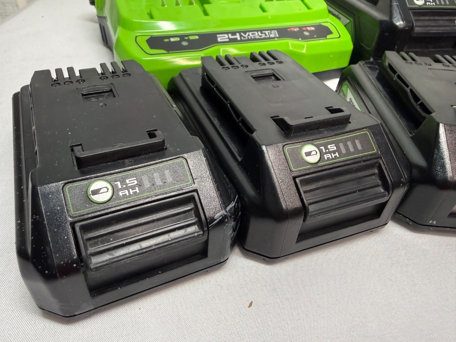 GREENWORKS Battery Charger and 2x4AH, 2x2AH, 3x1.5AH 24V Max Batteries and Bag