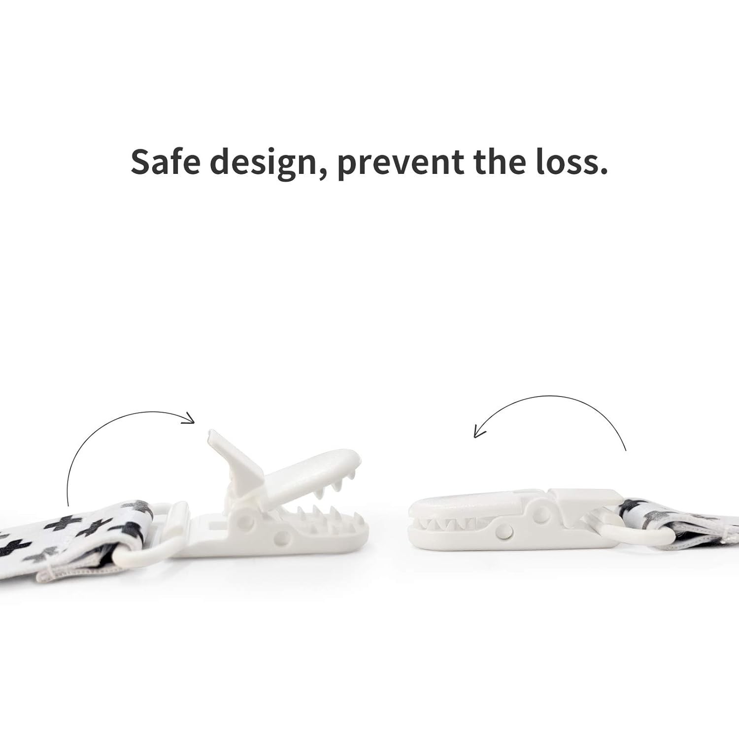 Особенности: Universal Clip, Quality Clasp, Short Strap, Safety, Easy to Clean, Universal pacifier leash, Holds soother, Holds burp cloths, Holds teething rings, Holds baby blankets, Holds drool bibs, Strong clasp, Heavy duty clasp, Gentle on clothes, Safety design, Shorter length for safety, Sanitary design, One-layer polyester fabric, Washable, Durable, Soft fabric, Rigorous material testing, Lead-free, PVC-free