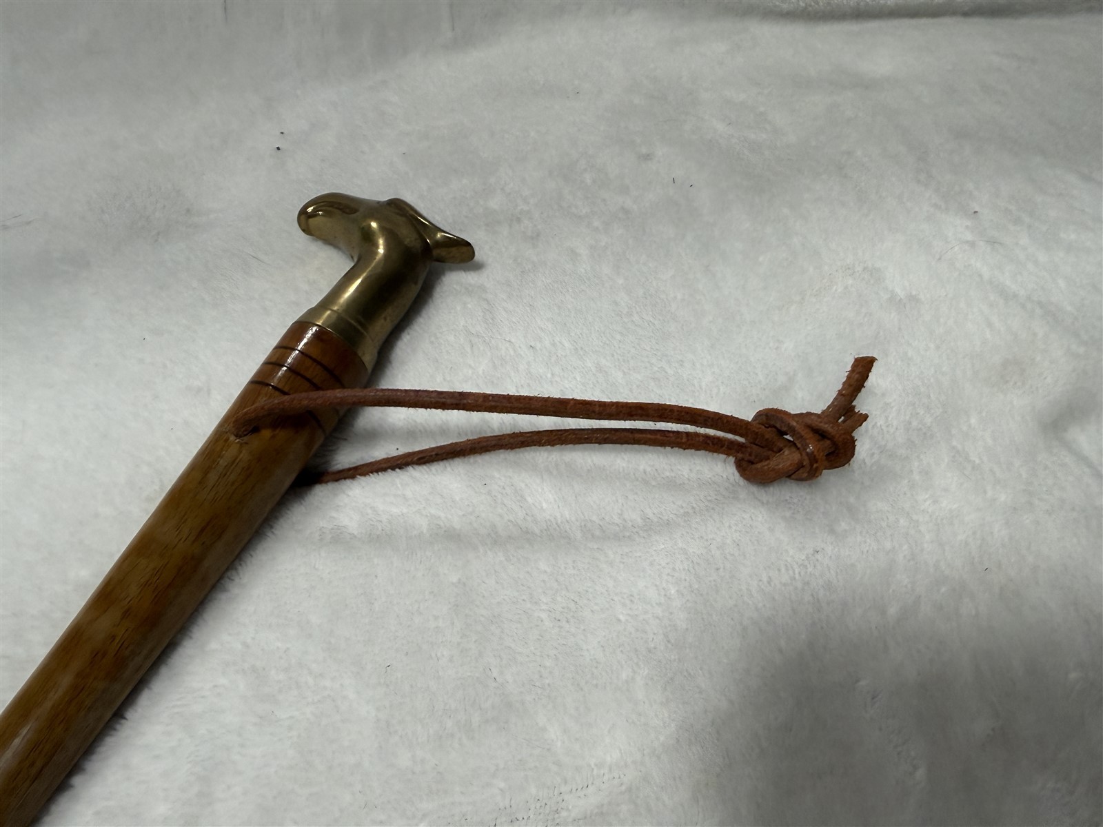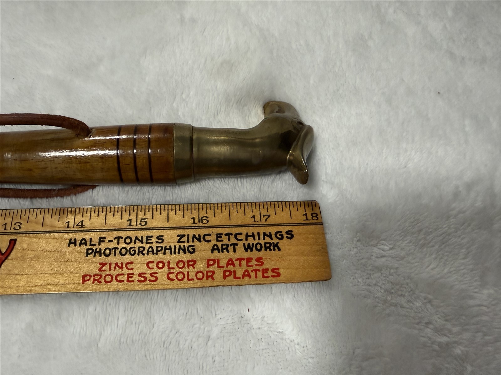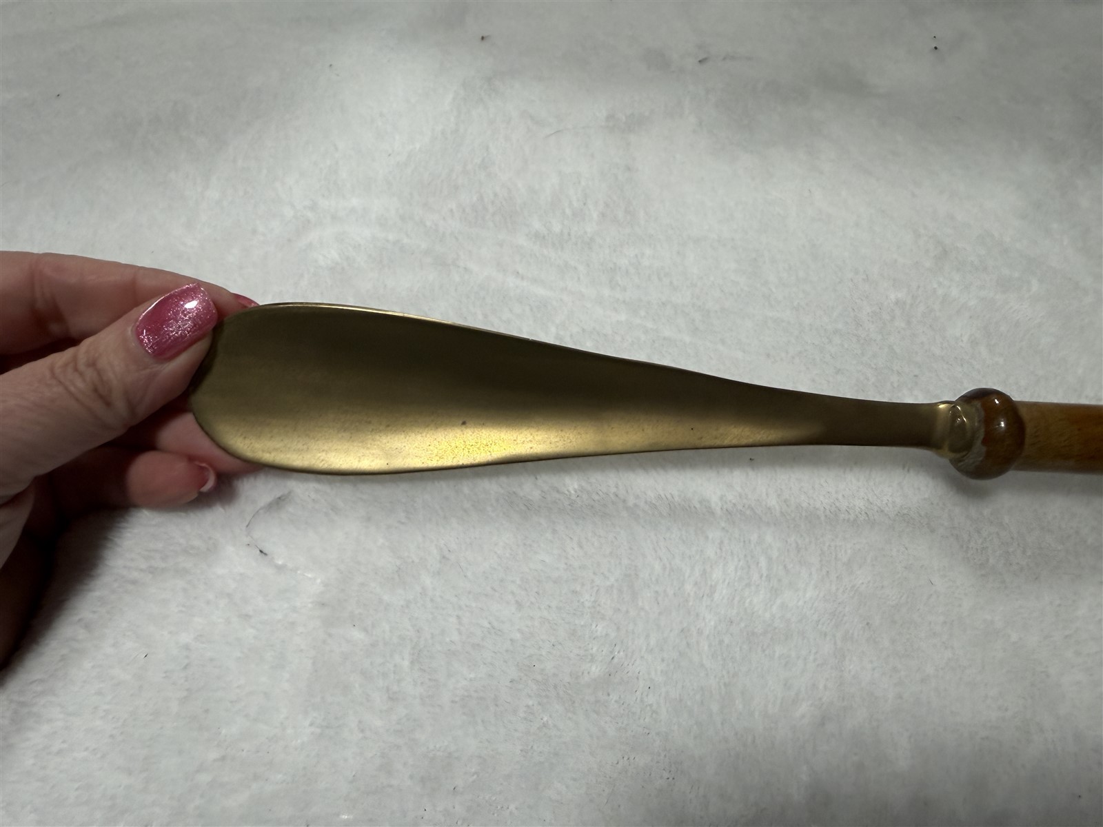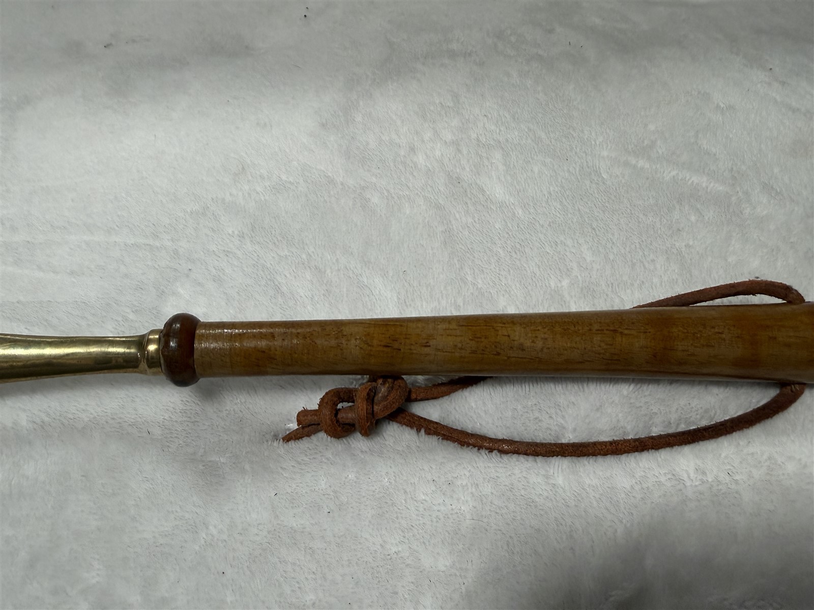 VINTAGE 18 SOLID BRASS WOODEN HANDLE EAGLE HEAD SHOE HORN W/ LEATHER HANG STRAP