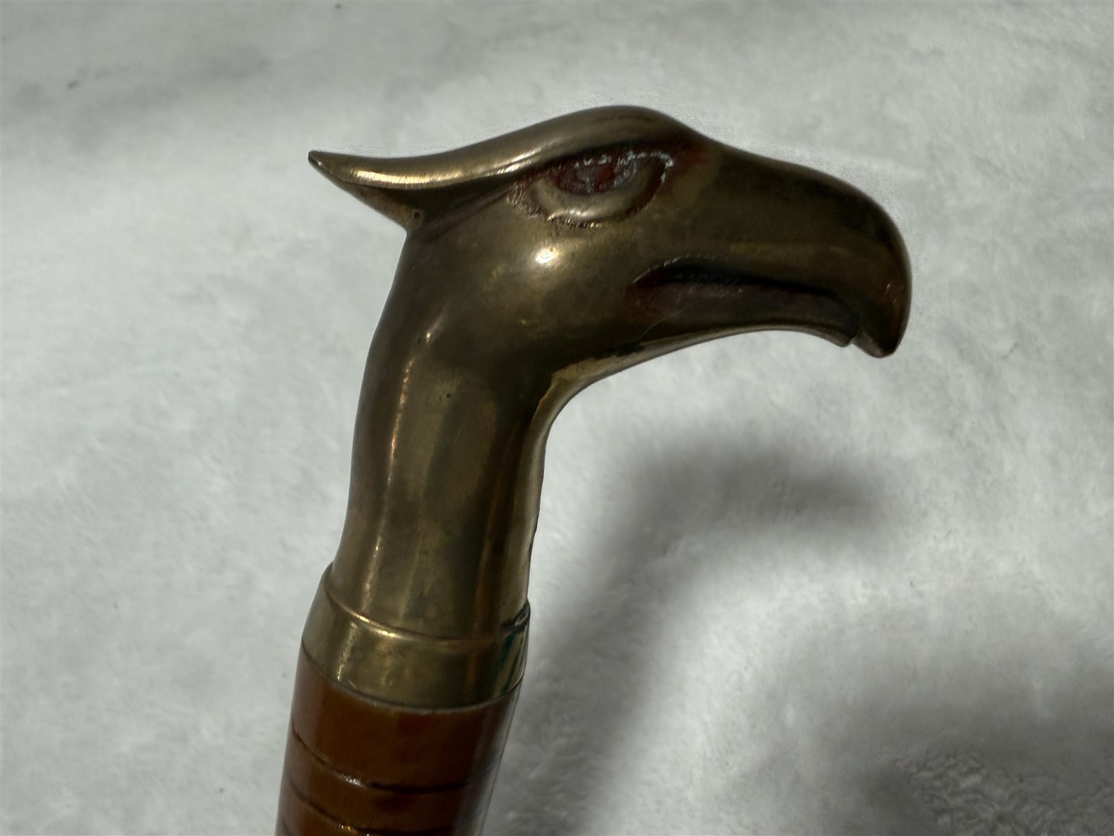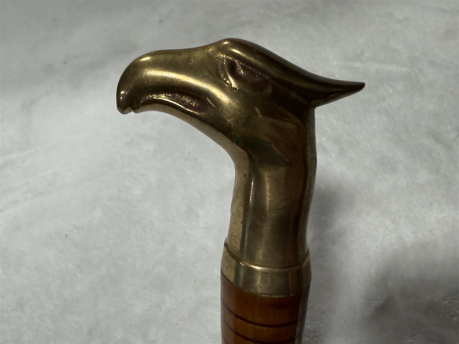 как выглядит VINTAGE 18" SOLID BRASS WOODEN HANDLE EAGLE HEAD SHOE HORN W/ LEATHER HANG STRAP фото