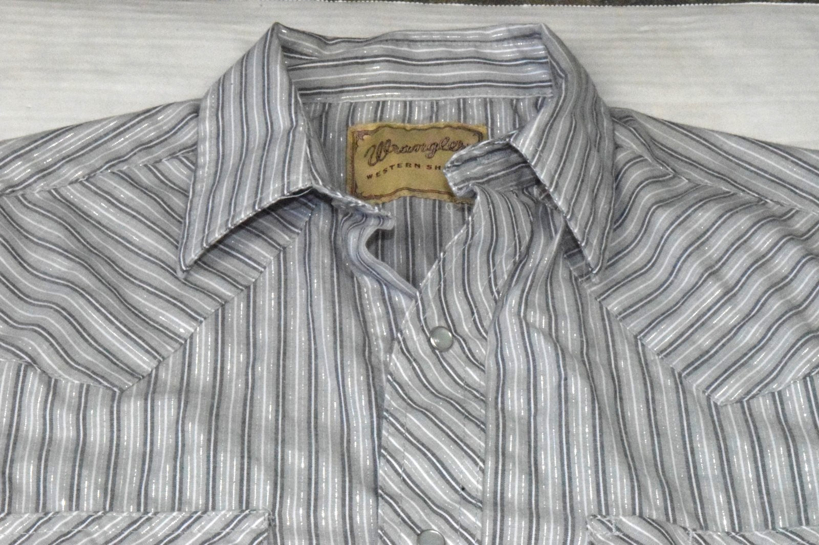 как выглядит Vintage Western Pearl Snap Shirt Wrangler Size M 90s Shimmering Silver Stripes фото