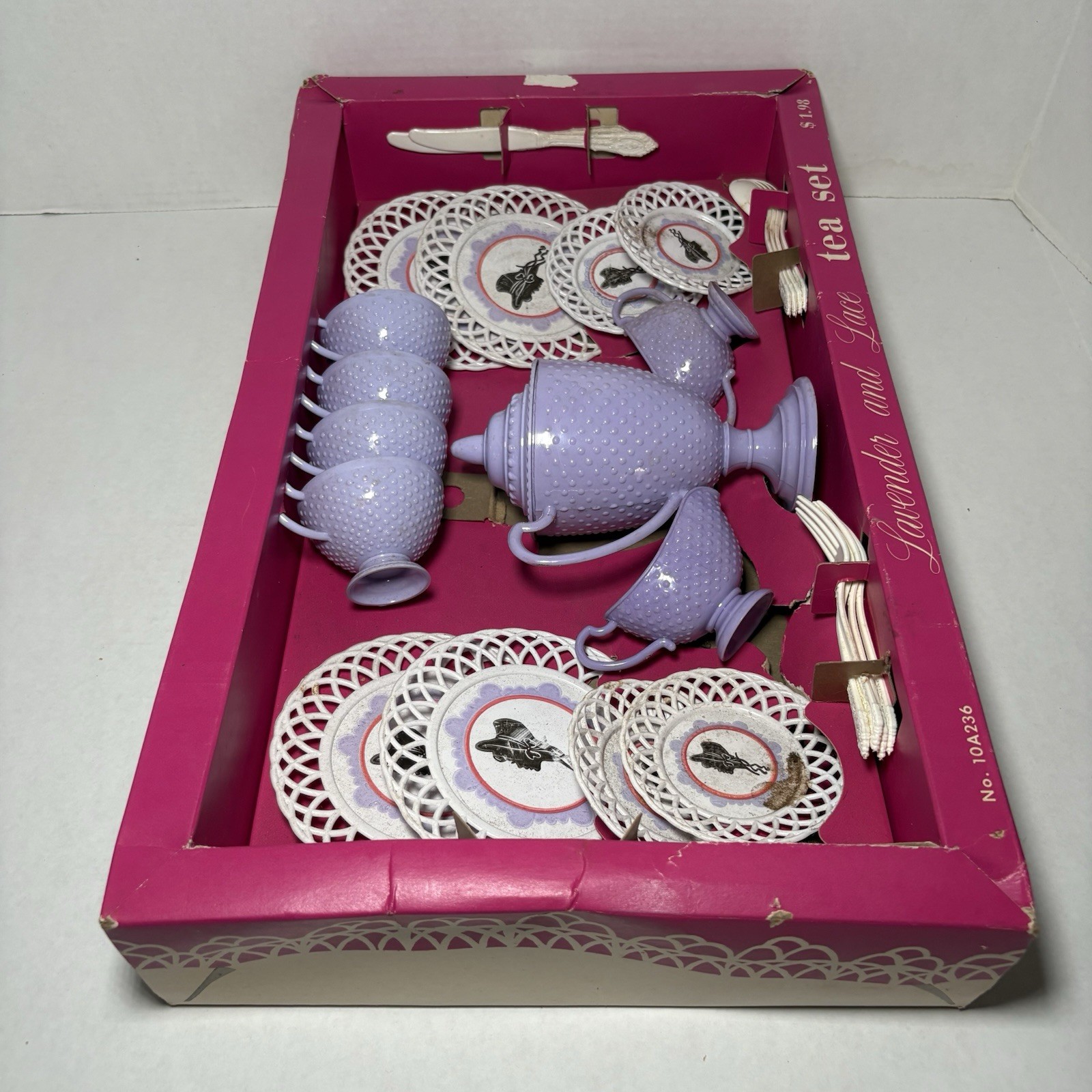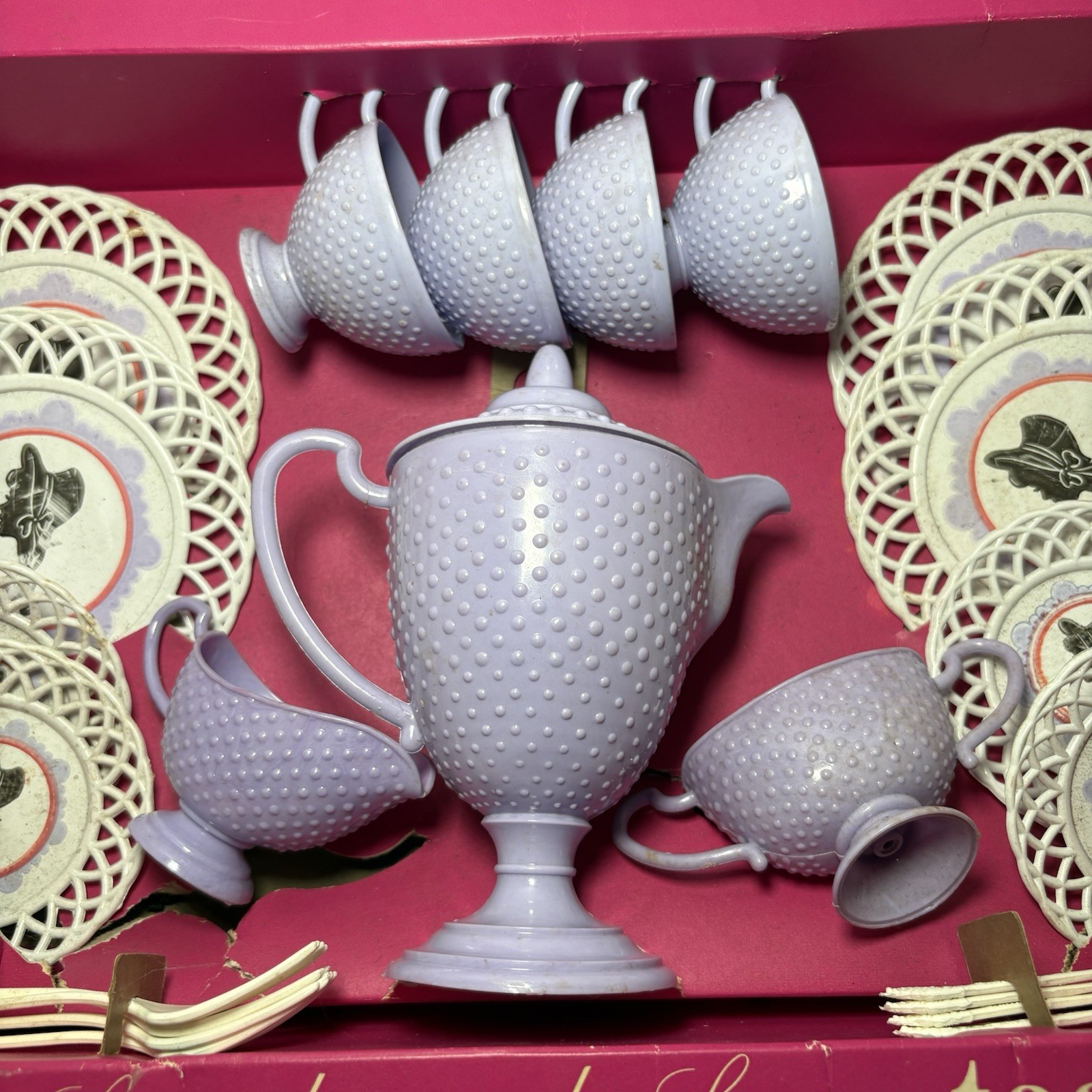 как выглядит Vintage Silhouette Plastic Kids Tea Set Lavender Lace New In Box NIB 1970s фото