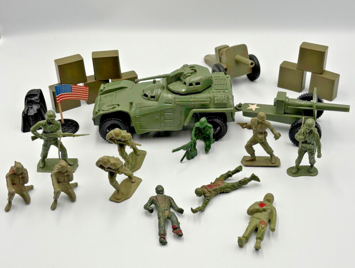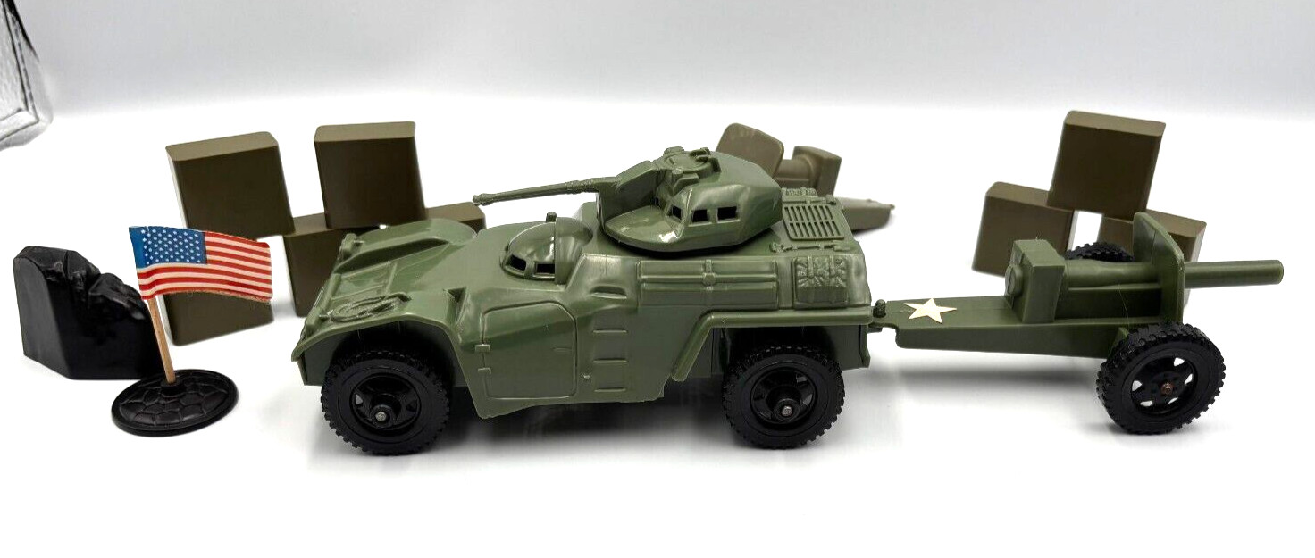 Vintage Tim-Mee Army Men 40pc Lot OD Green Staghound Armored Car Mortar USA 1960