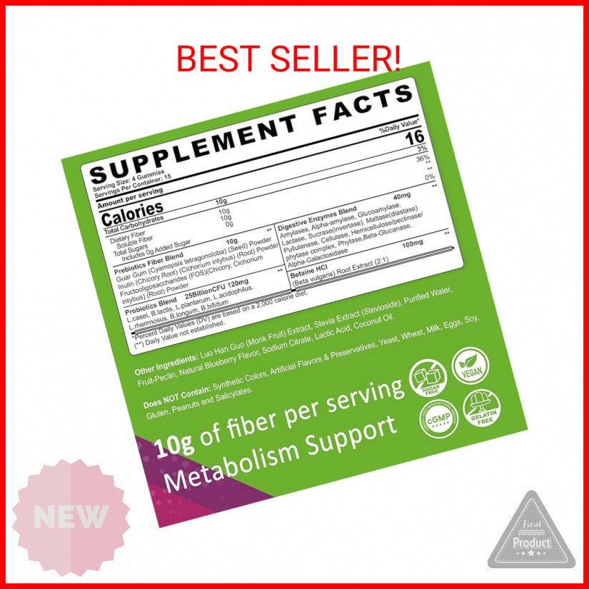 Fiber Gummies for Adults, Sugar Free 10g Prebiotic Fiber Supplement with Digesti