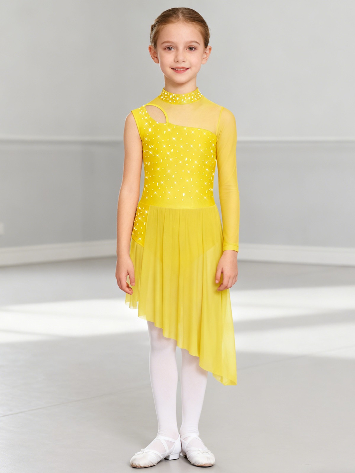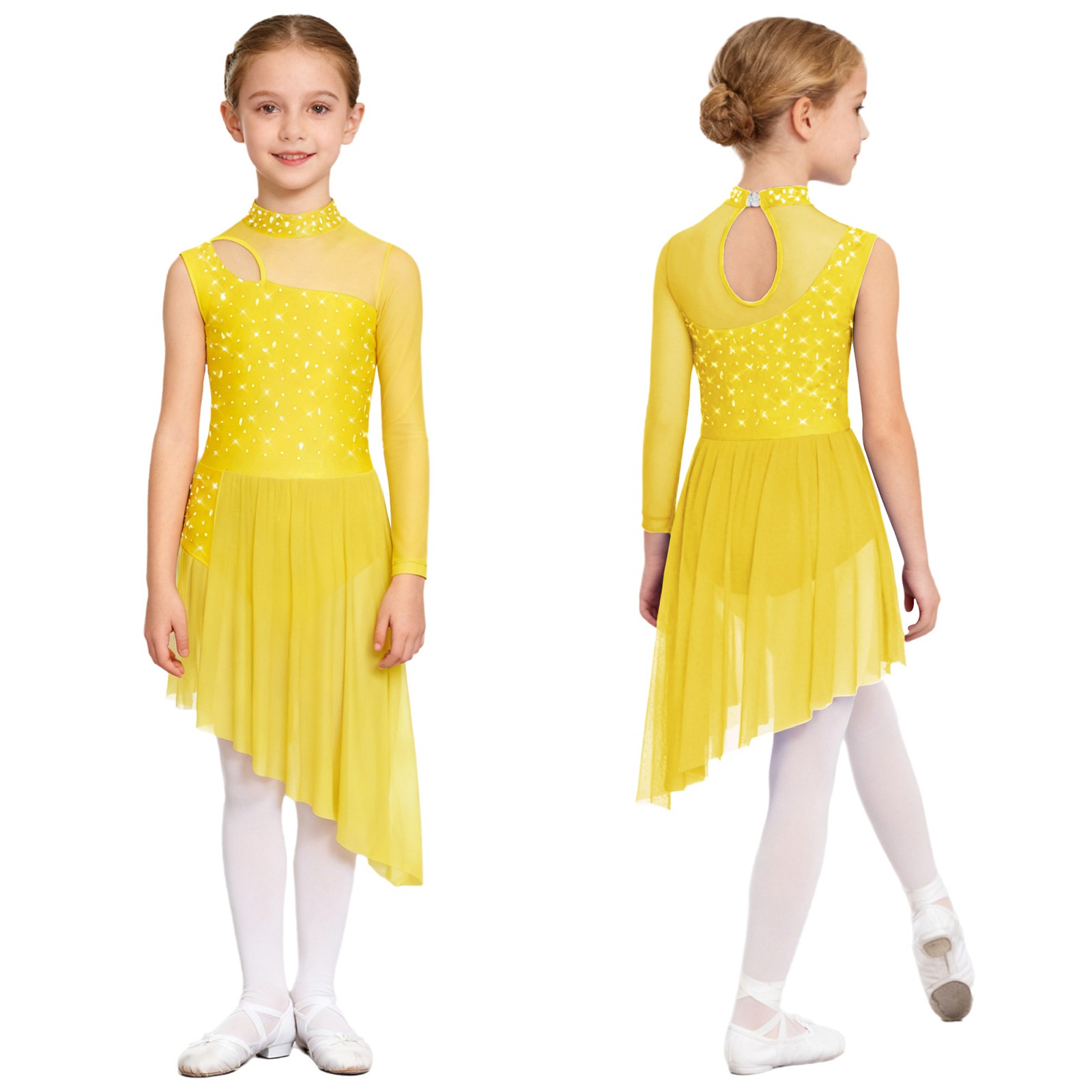 как выглядит Kids Girls Leotard Mock Neck Dresses Mesh Dancewear Cutout Dress Side Split фото