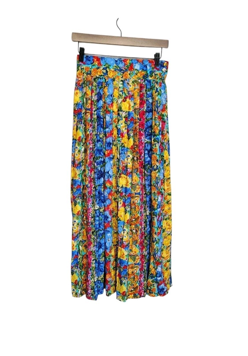 Vtg 90s Floral Pleated Maxi Skirt Size 8 High Waist Whimsical Colorful Statement