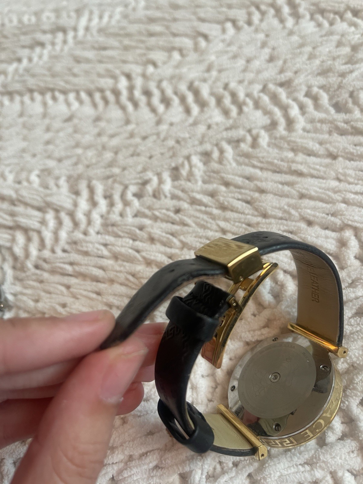 как выглядит Versace Swiss Made Dress Watch Gold-Plated Case Black Leather Band Analog фото