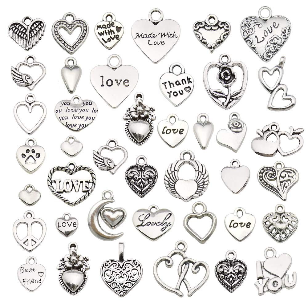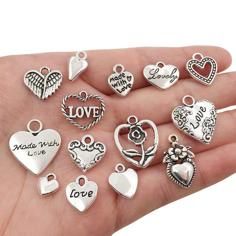 100 pcs Mix Antique Silver Heart Beads Charms for Jewelry Making Valentine's ...
