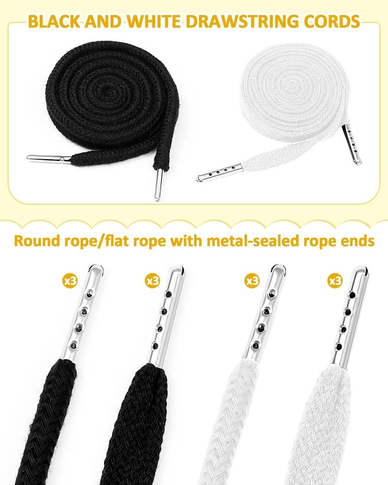 16pcs Drawstring Cord Kit-12pcs Hoodie Strings Flat Round,Black White with