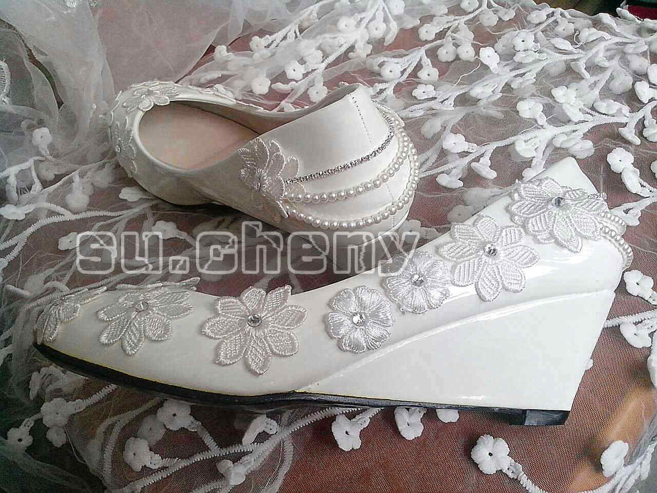 su.cheny Flat/4cm/7.5cm/wedge white pearl chain flats lace Wedding Bridal shoes