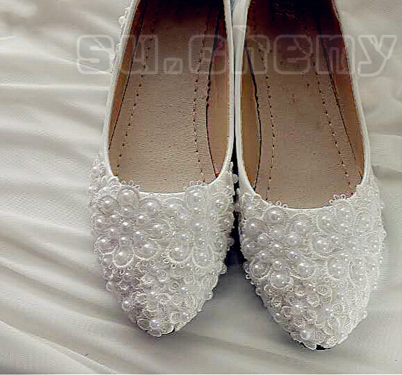 su.cheny White lace pearls wedge flats low heel pump heel Wedding Bridal shoes