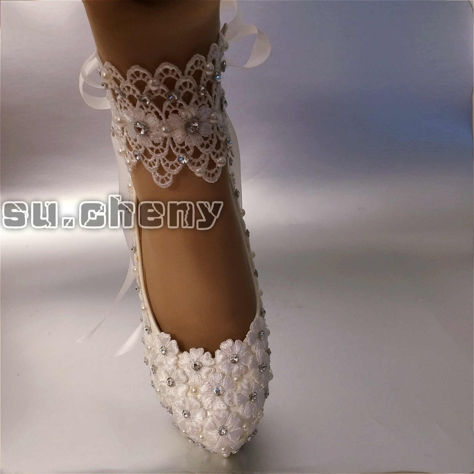 su.cheny Lace white ivory Wedding shoes Bridal flats low high heel pump 5-13