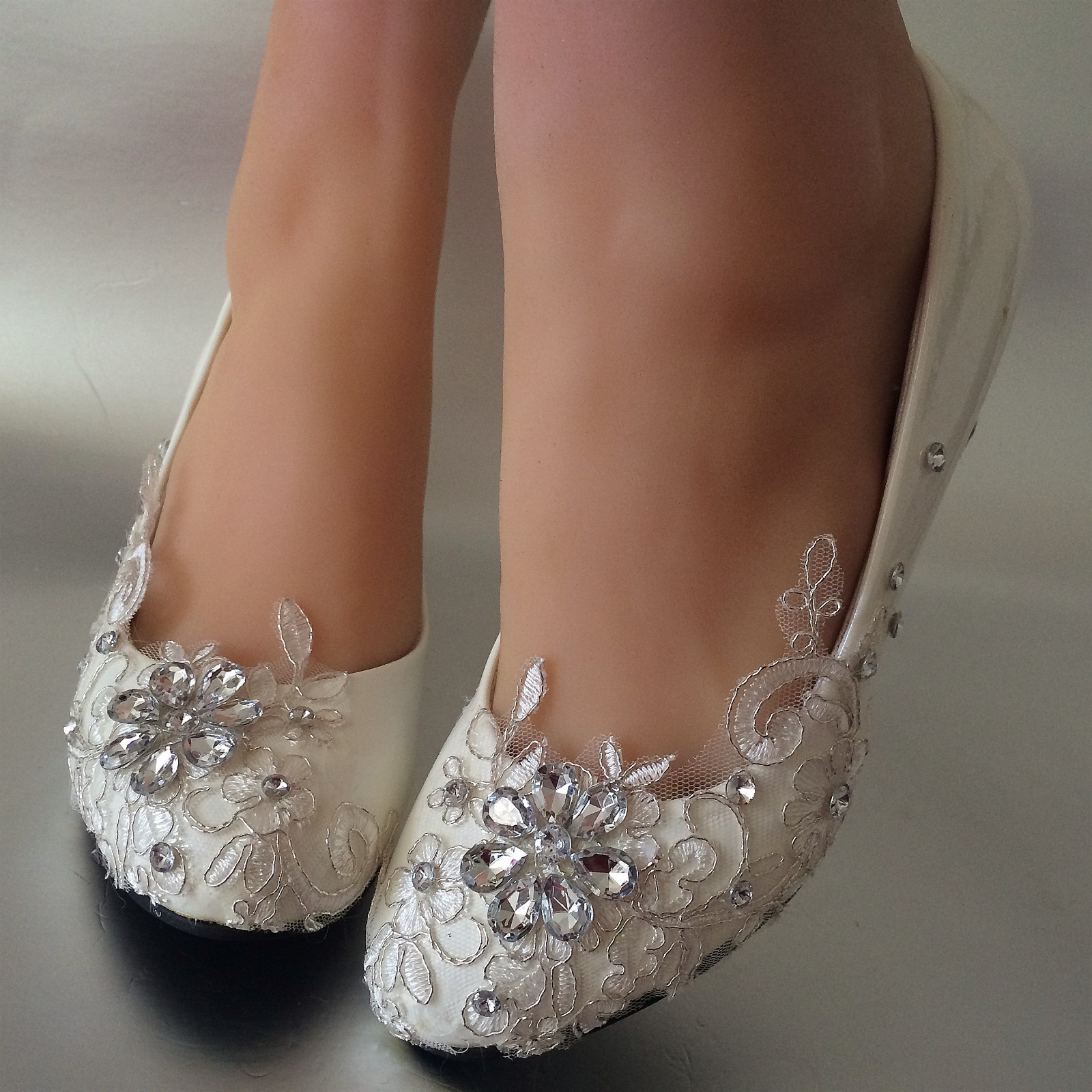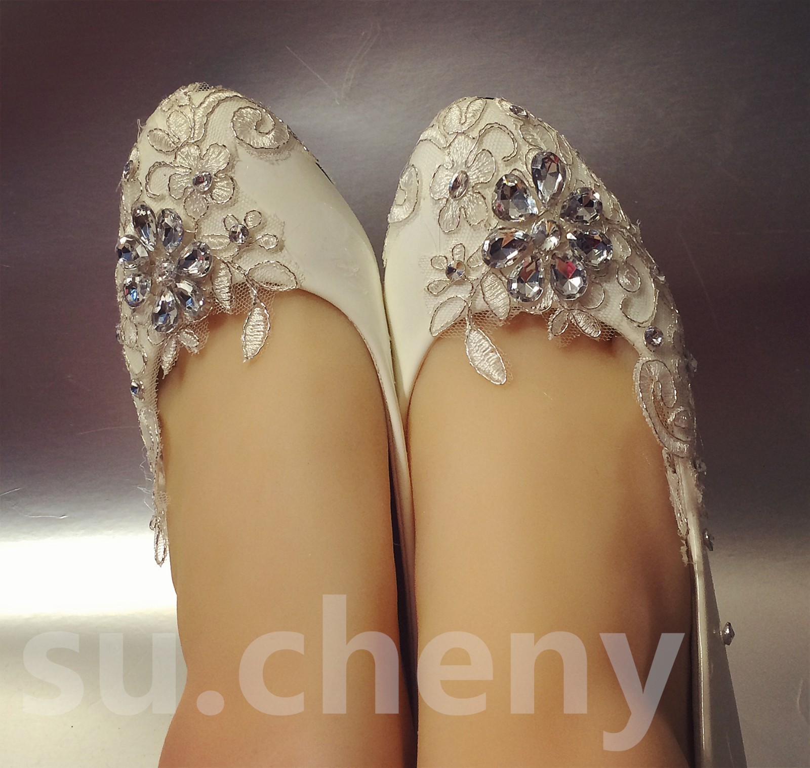 su.cheny- Lace white ivory crystal flats low high heel pump Wedding Bridal shoes