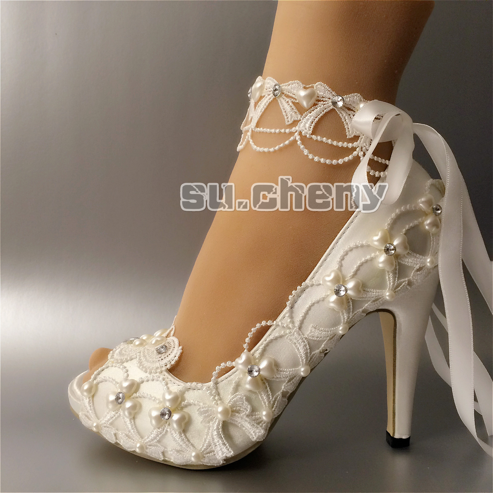 su.cheny Open toe 3 4 heel white ivory satin lace ribbon Wedding Bridal shoes