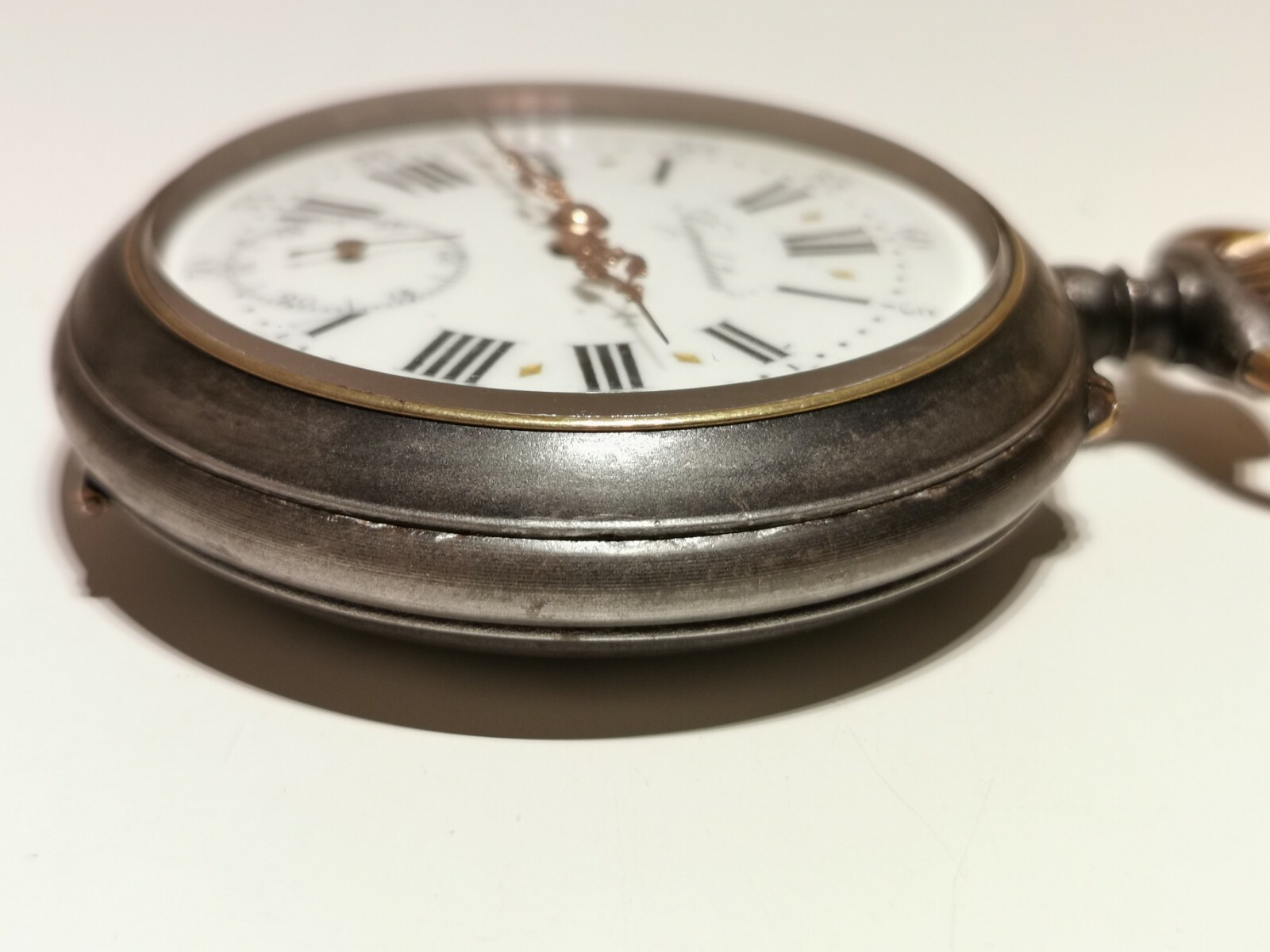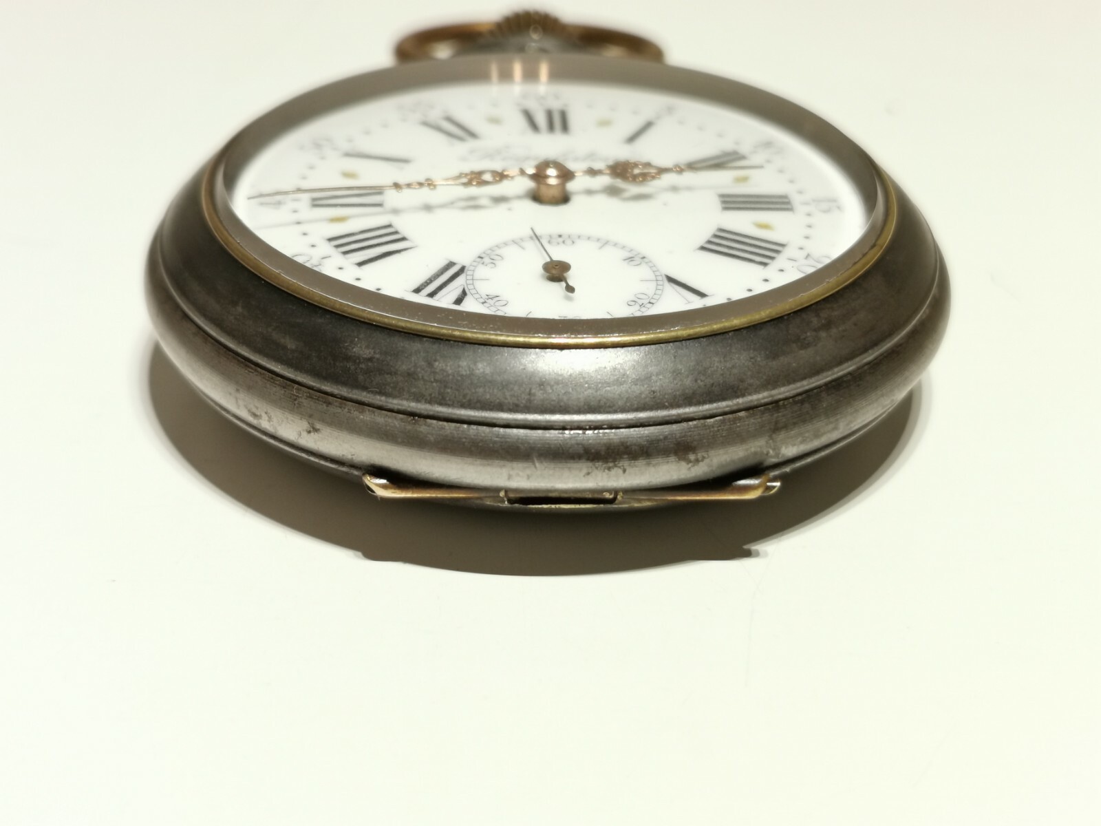как выглядит ANTIQUE BIG 67mm NICE GUN TONE STEEL FRANCE MENS POCKET WATCH "REGULATEUR" фото