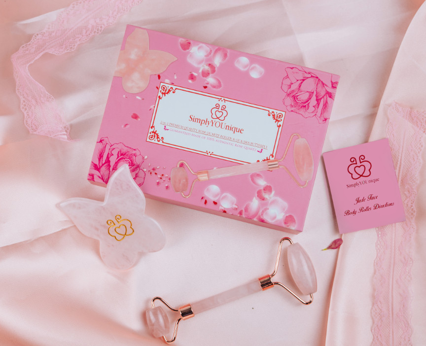 Rose Quartz Facial Roller Massager Butterfly Gua Sha Set for Face Jade Roller
