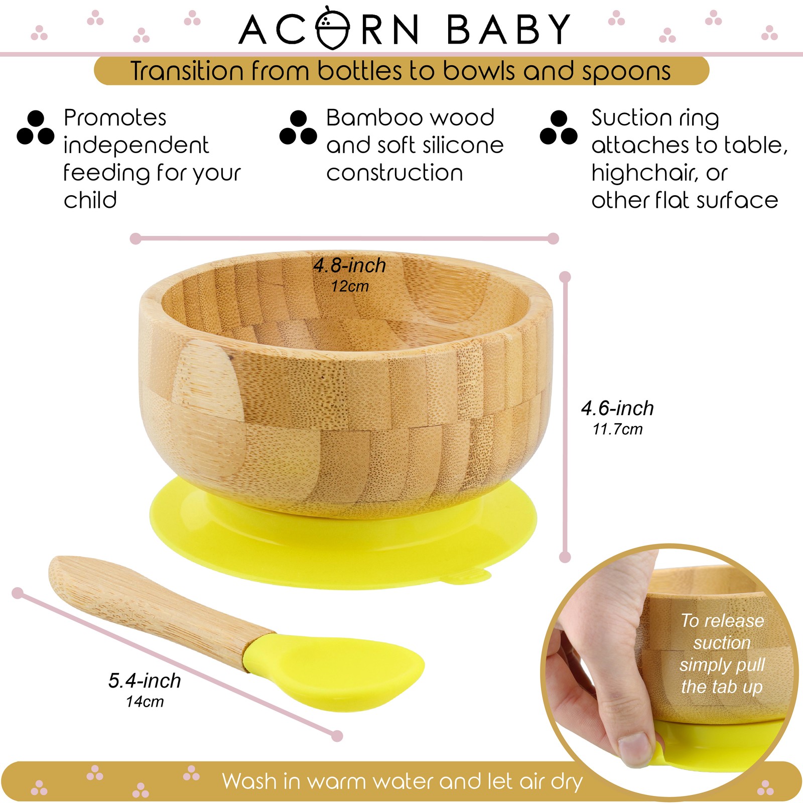 Acorn Baby Bamboo Baby Bowl and Silicone Baby Spoon Yellow Set for Solid Food