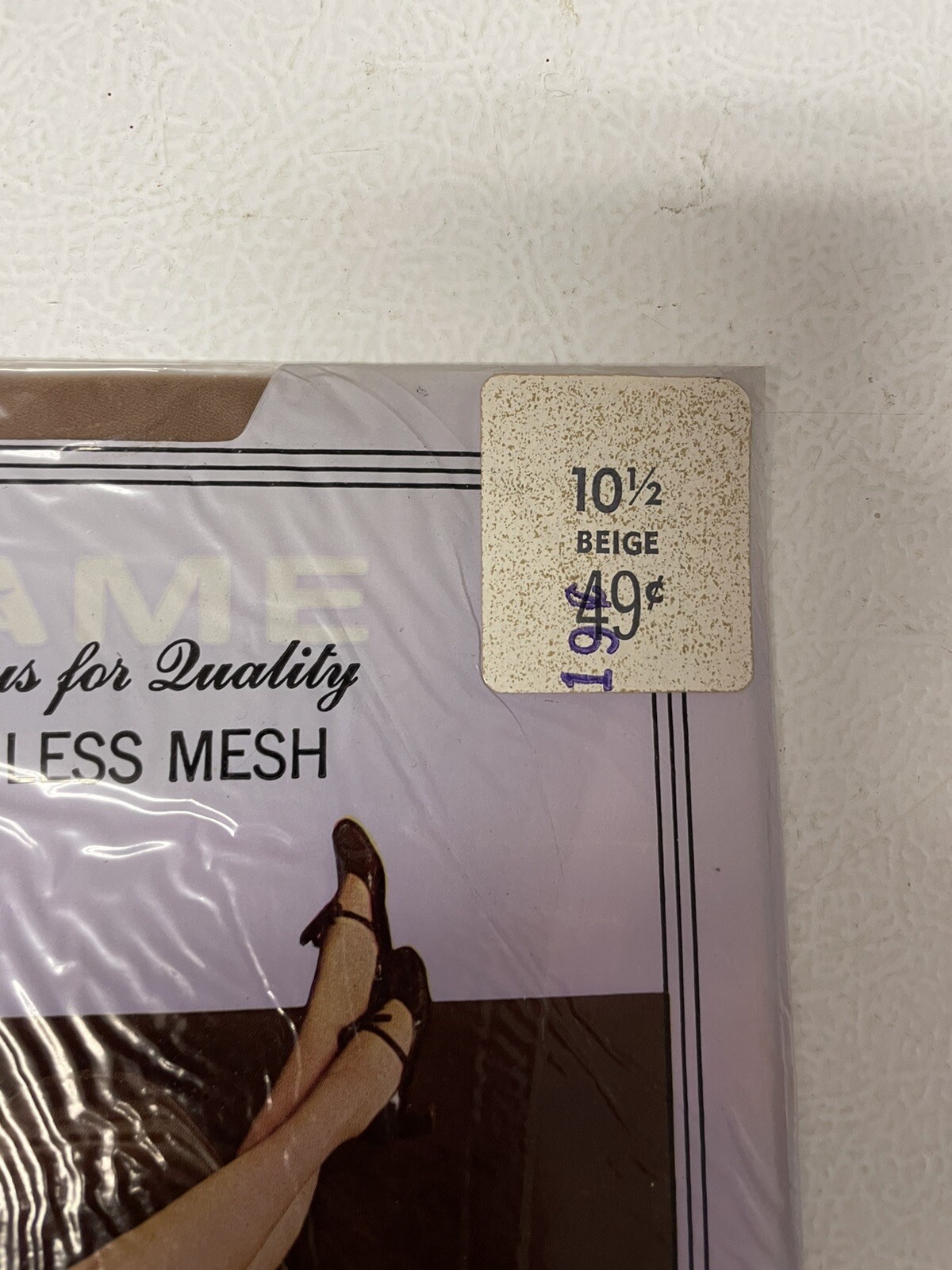 Vintage Fame Sheer Seamless Mesh Nylon Stockings Beige Size 10.5 NOS