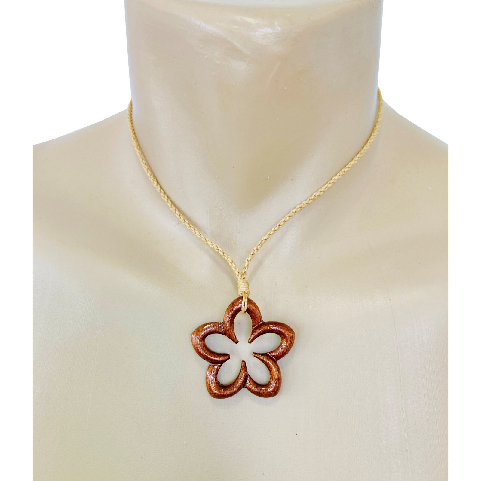 как выглядит Hawaiian Jewelry Koa Wood Hawaii Cut Out Plumeria Flower Pendant Necklace фото