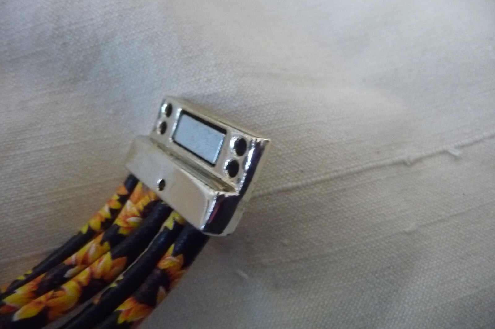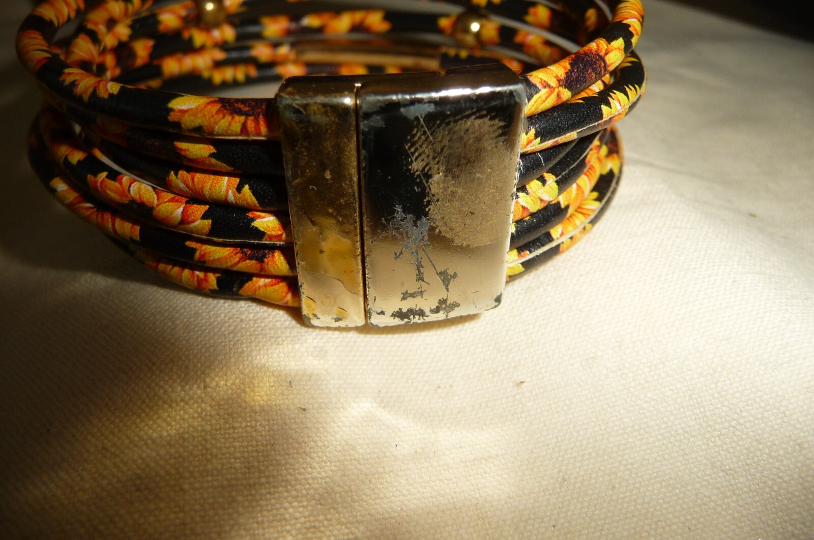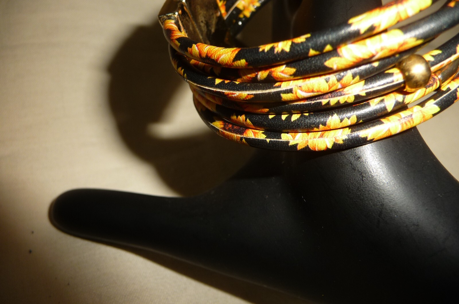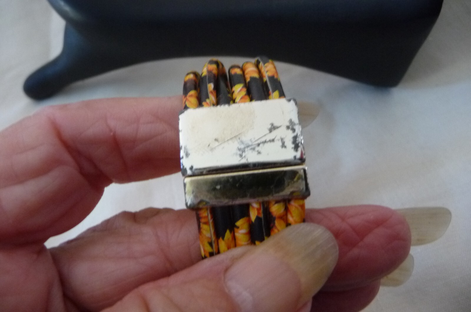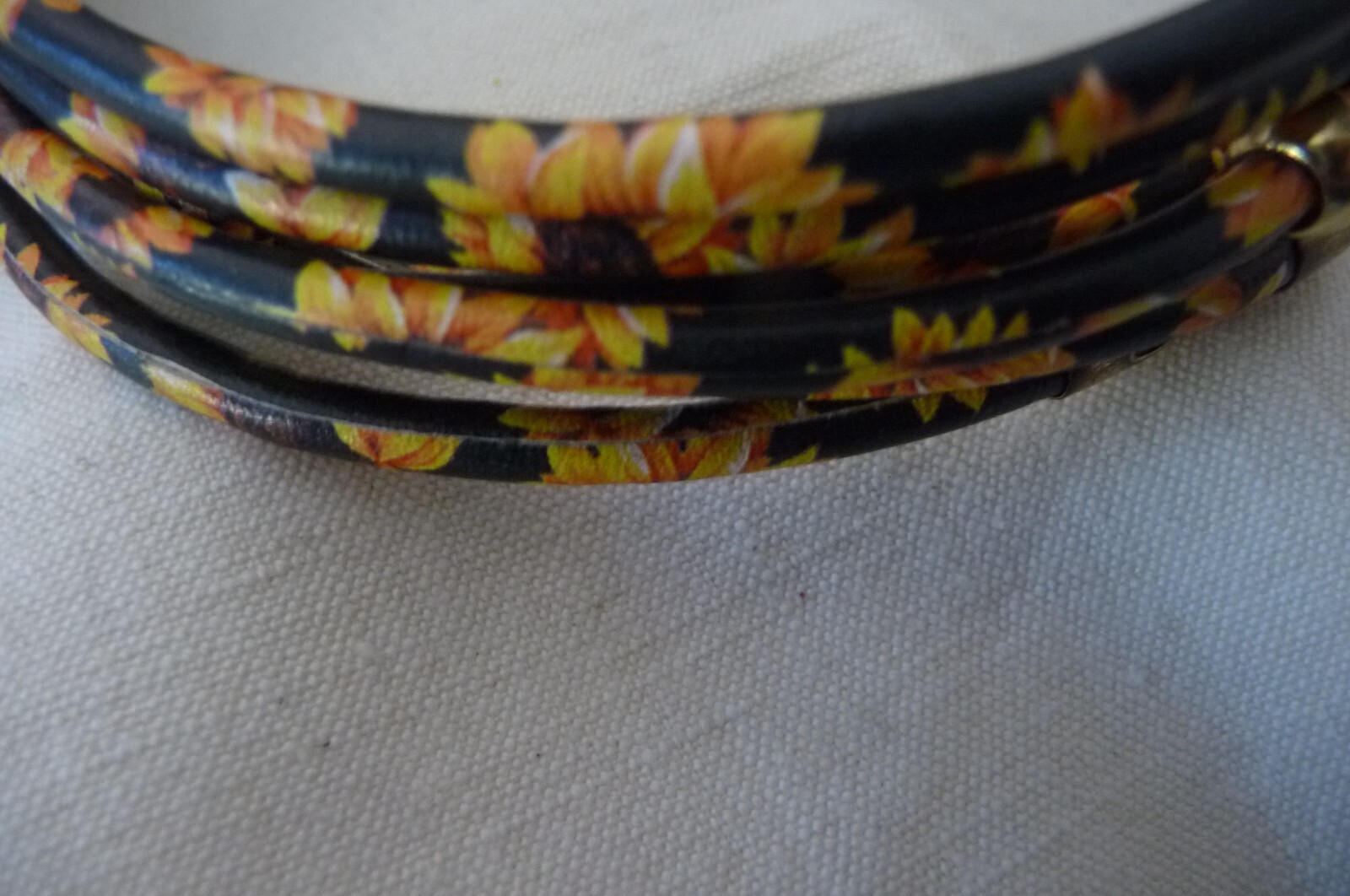 как выглядит A 1123X vtg BRACELET 6 ROWS BLACK VINYL W PRINTED YELLOW FLOWERS MAGNET CLASP фото