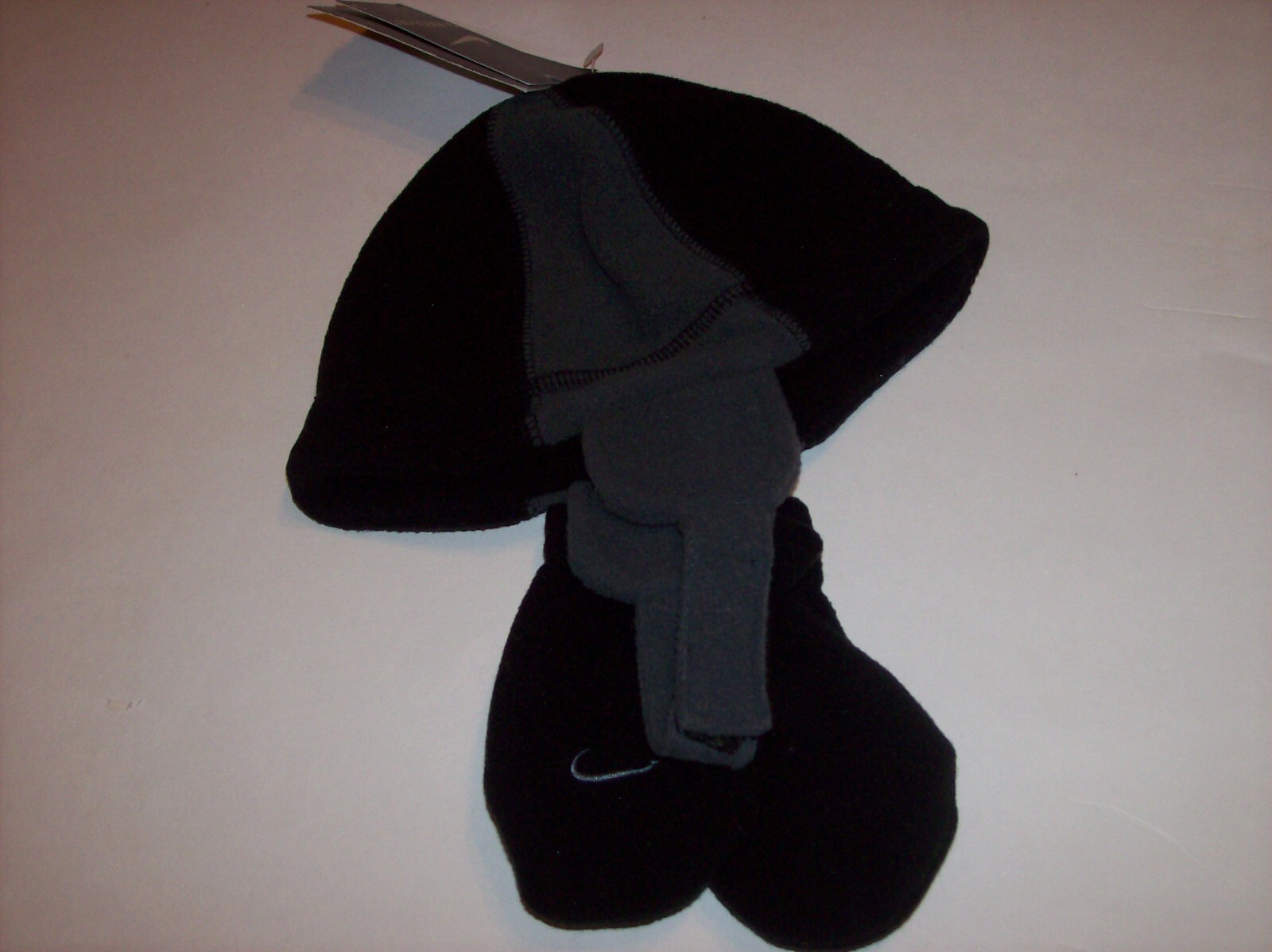 как выглядит Nike Hat Mitten Set Chin Strap Fleece Black Gray Swoosh Infant 12-24 Mos. New фото