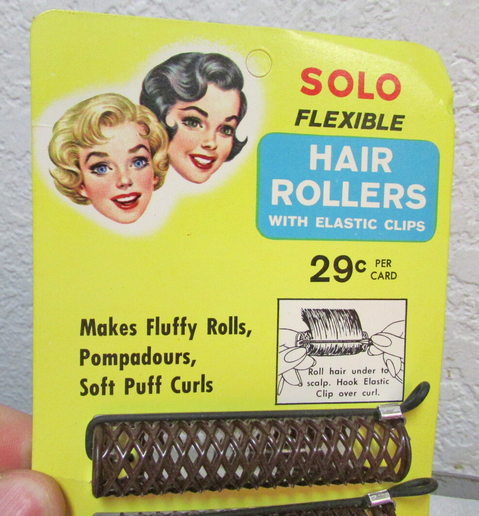 Vintage 1950s NEW original carded Solo brand Hair Curler Rollers w elastic clips