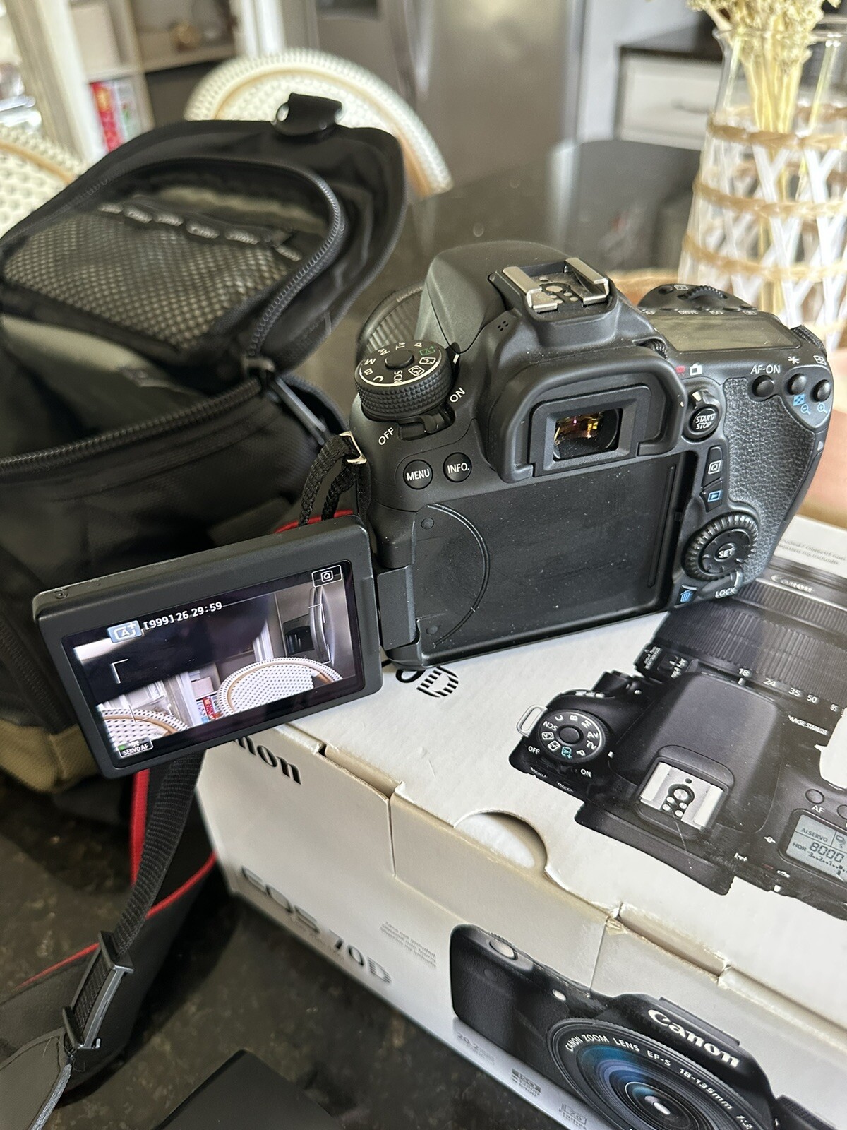 как выглядит Canon EOS 70D 20.2MP Digital SLR Camera with Zoom EF-S 18-55mm Lens, Flash, Bag фото