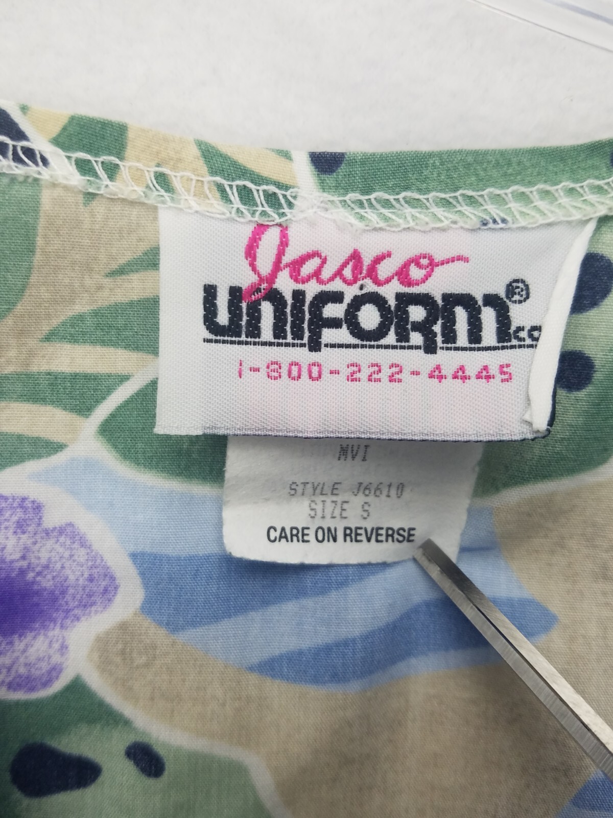 Jasco Uniform Top Womens Scrub SZ S Purple and Green Blue Leave Flower Pattern