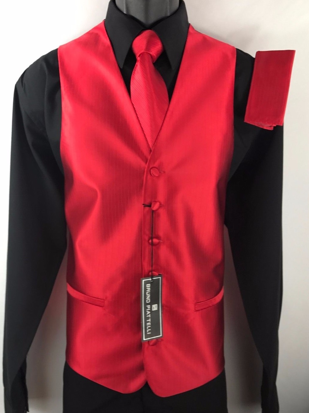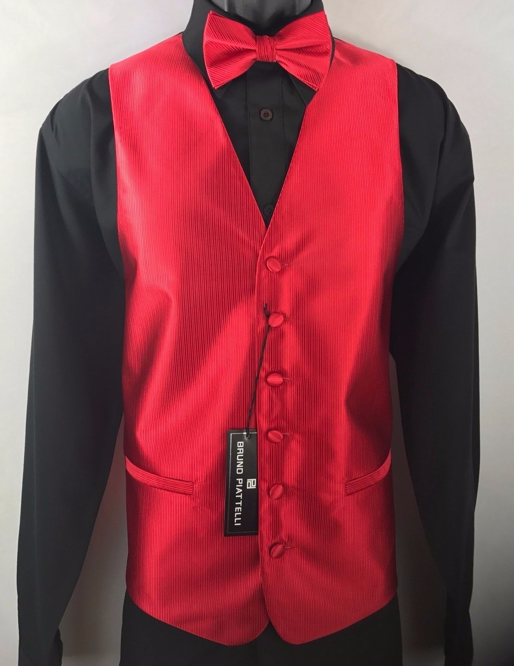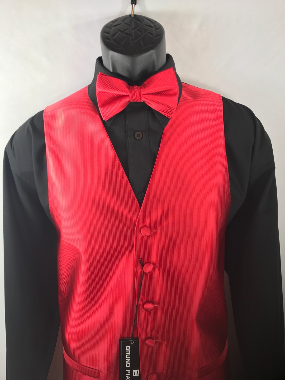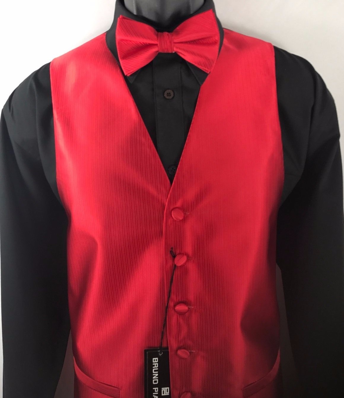 как выглядит Bruno Piattelli Roma Mens Red Tuxedo Formal 4 Piece Vest Tie Bow Tie Hanky 2XL фото