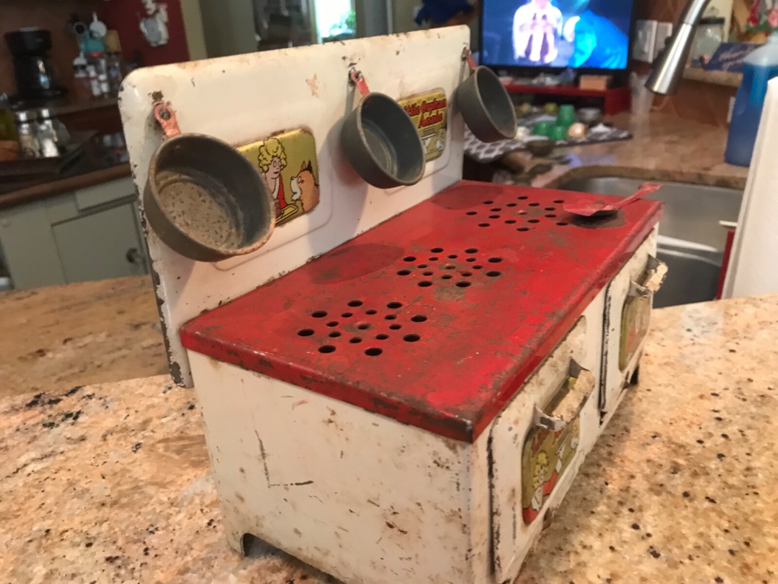 как выглядит Vintage Little Orphan Annie Toy Stove with 4 pieces of original tin cookware. фото