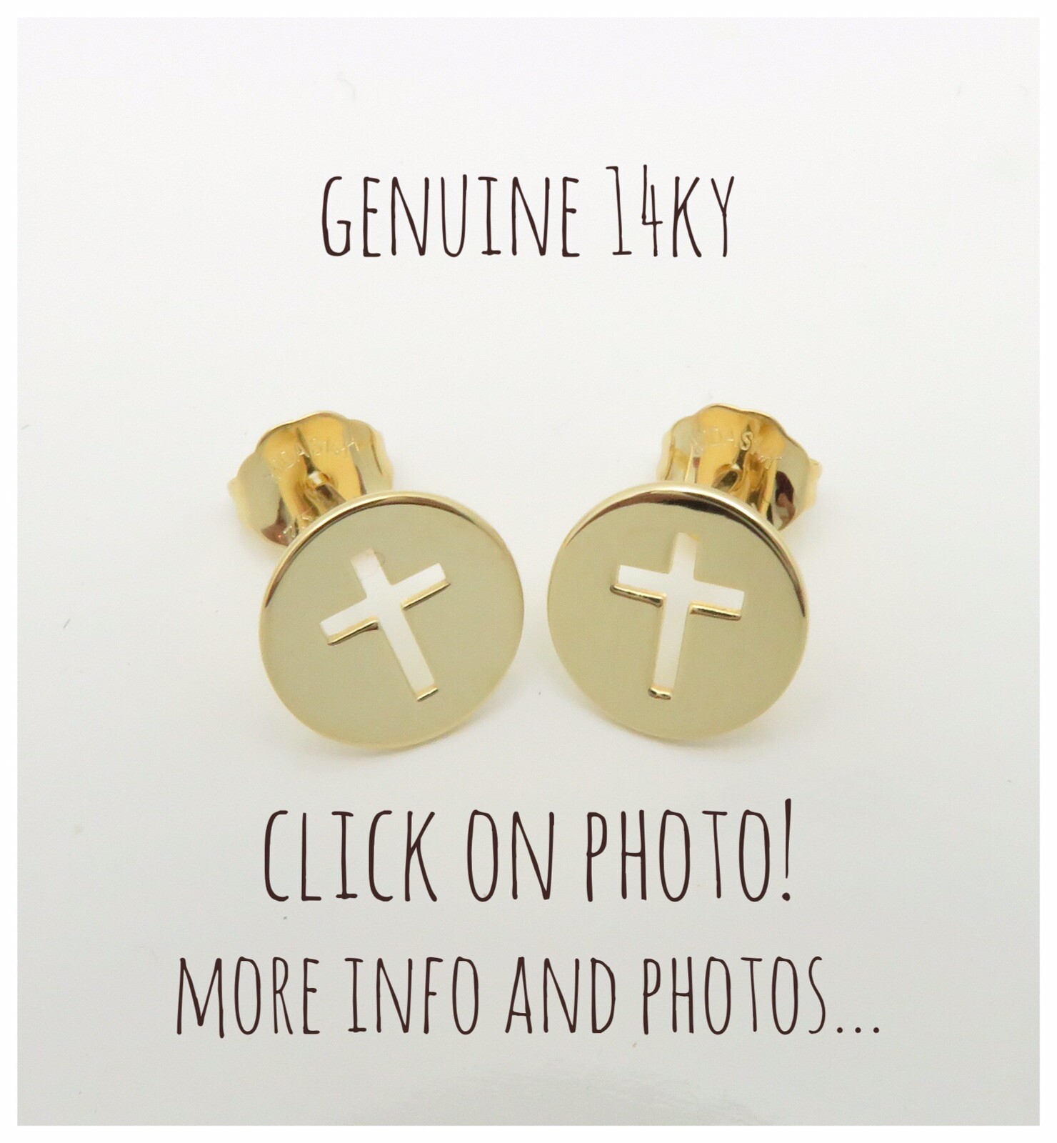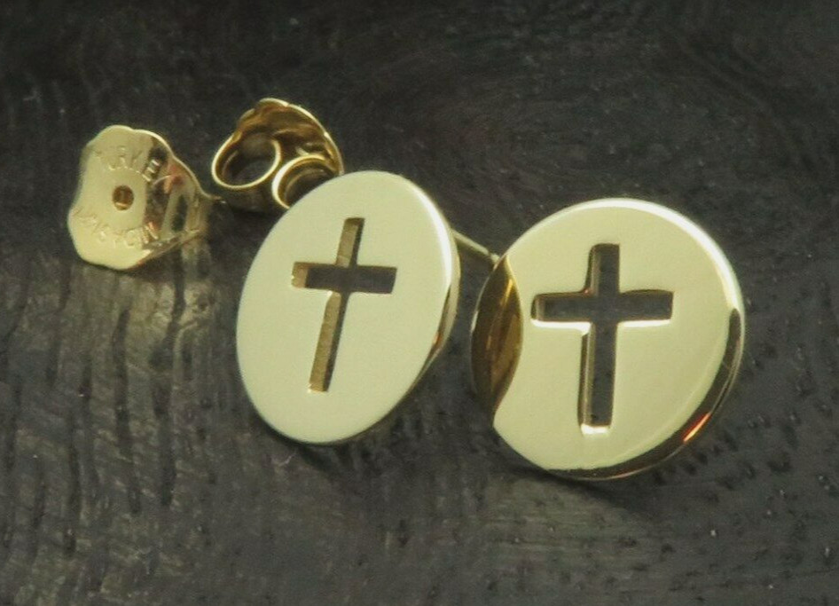 как выглядит 14K SOLID YELLOW GOLD CROSS EARRINGS ROUND FLAT STUDS CROSSES CUTOUT 3/8" Midas фото